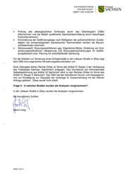 Prüfung des altbergbaulichen Einflusses durch das Oberbergamt (OBA) (Recherchen und bei Bedarf qualifizierte Sachstandsermittlung durch beauftragte Fachunternehmen); Einschätzung der Gefährdungslage nach Maßgaben der polizeirechtlichen Zustän- digkeit; bei schwerwiegenden baustatischen Sachverhalten werden die Bauauf- sichtsbehörden informiert. Störerauswahl, Nutzungsrestriktionen ggü. Eigentümer/Störer, Einleitung von Erst- sicherungsmaßnahmen (Absperrung und Nutzungseinschränkungen im Gefähr- dungsbereich) bzw. Planung mit anschließender Sanierung. Für die Arbeiten zur Sicherung eines Schadensfalls in der Löbauer Straße in Zittau liegt dem OBA eine sogenannte Verwahrungsdokumentation vor. Einer Übergabe stehen Rechte Dritter im Sinne des Artikel 51 Absatz 2 der Verfassung des Freistaates Sachsen (SächsVerf) entgegen. Das Grundrecht auf informationelle Selbstbestimmung aus Artikel 33 SächsVerf zählt zu den Rechten Dritter im Sinne des Artikel 51 Absatz 2 SächsVerf. Das OBA hat den betroffenen Grund- und Hauseigentü- mer um Einwilligung zur Übergabe der Unterlage im Zusammenhang mit der Kleinen Anfrage gebeten. Diese wurde nicht erteilt. Frage 4: In welchen Straßen wurden die Analysen vorgenommen? In der Löbauer Straße in Zittau wurden die Analysen vorgenommen. Mit freundlichen Grüßen Martin Dulig Seite 2 von 2