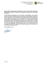 STAATSMlNlSTERlUM FÜR SOZlALES UND GESELLSCHAFTUCHEN ZUSAMMENHALT ~ SACHSEN Frage 4: Gibt es ggf. alternative Konzeptionen zu solch einer zentralen Aufnahmes- tation? Wenn ja, welche mit welchen zu erbringenden Leistungen und veranschlag- ten Kosten? Es gibt alternative Überlegungen zu einer zentralen Aufnahmestation. Der Landestier- schutzverband hat dem Staatsministerium für Soziales und Gesellschaftlichen Zusammen- halt eine Konzeption einer dezentralen Betreuung illegal nach Deutschland eingeführter Welpen vorgestellt, nach der ein Tierheim mit speziellen Kenntnissen der Mitarbeitenden und geeigneten Quarantäneplätzen als Anlaufstelle für die unterzubringenden Welpen dient und nach welcher sichergestellt werde, dass die Tiere an angeschlossene Tierheime weitervermittelt würden, wenn das zentral angesprochene Tierheim voll sei. Die Konzep- tion wurde in der Sitzung des Landesbeirats für Tierschutz am 02.03.2022 erstmals bera- ten. Es wurde vorgeschlagen, dass die Konzeption den für die Unterbringung der Tiere zuständigen Veterinärämtern vorgestellt wird. Weitere Beratungen für eine mögliche Um- setzung bleiben daher abzuwarten. Seite 2 von 2