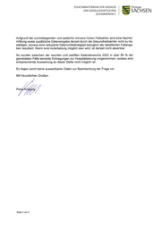 STAATSMlNlSTERlUM FÜR SOZlALES UND GESELLSCHAFTUCl--lEN ZUSAMMENHALT 5jSACHsEN Aufgrund der zurückliegenden und weiterhin immens hohen Fallzahlen sind eine Nacher- mittlung sowie zusätzliche Dateneingabe derzeit durch die Gesundheitsämter nicht zu be- wältigen, woraus eine reduzierte Datenvollständigkeit bezüglich der detaillierten Fallanga- ben resultiert. Wann eine Aufarbeitung möglich sein wird, ist derzeit nicht absehbar. So wurden zwischen der neunten und zwölften Kalenderwoche 2022 in über 85 % der gemeldeten Fälle keinerlei Eintragungen zur Hospitalisierung vorgenommen, sodass eine entsprechende Auswertung an dieser Stelle nicht möglich ist. Es liegen somit keine auswertbaren Daten zur Beantwortung der Frage vor. Mit freundlichen Grüßen Seite 2 von 2