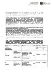 STAATSMINISTERIUM Freistaat FÜR WISSENSCHAFT SACHSEN KULTUR UND TOURISMUS Es besteht die Möglichkeit, über die Projektförderung der SLfM und des DZK Provenienzforschungsprojekte zu realisieren. Ein gesondertes Programm im Freistaat Sachsen gibt es nicht, auch mangels Nachfrage. 2022 wurde gemeinsam mit dem 2021 am Daphne-Projekt der SKD ins Leben gerufenen Provenienzberatungsteam ein Informationsfaltblatt zur Provenienzforschung herausgegeben. Für Januar 2023 ist eine coronabedingt bisher verschobene Fachtagung mit dem Stadtgeschichtlichen Museum Leipzig, dem vorgenannten Provenienzberatungsteam und der AG Provenienzforschung an der Konferenz der Museumsberatungsstellen in den Ländern sowie dem sächsischen AK Provenienzforschung geplant, in diesen AG/AK arbeitet die SLfM mit, die auch Anträge beim DZK unterstützt. Sächsische Landesbibliothek - Staats- und Universitätsbibliothek Dresden (SLUB) /Sächsische Landesfachstelle für Bibliotheken (LFS1 Ab dem Jahr 2021 wurde durch eine neue Stelle an der SLUB eine Koordinierungsstelle NS-Raubgut an der LFS geschaffen, die die öffentlichen (kommunalen) Bibliotheken vor allem in den ländlichen Räumen zu allen Fragen der Provenienzforschung berät (siehe hierzu auch die Antwort zu Frage 5- SLUB/LFS). In der ersten Arbeitsphase verschafft sich die LFS einen Überblick über den tatsächlichen Umfang von Altbeständen in öffentlichen Bibliotheken, ermittelt den Unterstützungsbedarf, konzipiert thematische Weiterbildungen für Bibliothekare, unterstützt die Öffentlichkeitsarbeit und betreut die Arbeitsgemeinschaften Altbestand (AG AB) und Provenienzforschung in Sachsen (AG PiS). Frage 2: Wie viele Anträge auf Bezuschussung der Eigenmittel wurden von kommunalen, nichtstaatlichen Einrichtungen in den letzten 5 Jahren gestellt, bewilligt und abschlägig beschieden? (bitte nach Anzahl der Antragsteller/Einrichtung, Jahr, Höhe der Eigenmittel und Fördersumme auflisten) Anzahl der Einrichtung Projekt Jahr Höhe der Förder Anträge Eigenmittel summe (Fortlaufende (€) Nummerierung) (€) Görlitzer Sammlungen für NS-Raubkunst in den 1 Beständen der Görlitzer Geschichte und Sammlungen. 1.928,20 7.712,78 (Bewilligt) Kultur, 2017 Kulturhistorisches Recherche, Museum Görlitz Dokumentation und Veröffentlichung Provenienzrecherchen Görlitzer zu kriegsbedingt 2 1.071,00 4.284,00 Sammlungen für verlagerten 2022 (Geplant) Geschichte und Museumsgütern der Kultur, Görlitzer Sammlungen Seite 2 von 4