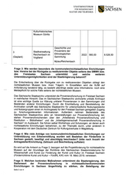 STAATSMINISTERIUM Freistaat FÜR WISSENSCHAFT SACHSEN KULTUR UND TOURISMUS Kulturhistorisches Museum Görlitz Geschichte und Stadtverwaltung Provenienz der 3 Reichenbach im Ethnologischen 2022 560,00 8.526,50 (Geplant) Vogtland Sammlung Mylau/Reichenbach Frage 3: Wie werden besonders die kommunaien/nichtstaatlichen Einrichtungen bzw. Vereine bei der Rückgabe zu restituierender Objekte seitens des SMWK bzw. des Freistaates Sachsen unterstützt und weiche weiteren Unterstützungsmöglichkeiten sind der Staatsregierung bekannt? Die Entscheidung über die Rückgabe von zu restituierenden Objekten obliegt den nichtstaatlichen Museen bzw. ihren Trägern. In Einzelfällen wird die SLfM auf Anforderung beratend tätig, es besteht allerdings weder eine Informations- noch eine Meldepflicht für solche Fälle seitens der nichtstaatlichen Museen. Das Sächsische Staatsarchiv unterstützt die Provenienzforschung im Freistaat Sachsen in mehrfacher Hinsicht. Das im Sächsischen Staatsarchiv archivierte unikale Archivgut ist eine wichtige Quelle zur Klärung unklarer Provenienzen in den Sammlungen und Beständen anderer Einrichtungen. Durch die Erschließung und Bereitstellung der Archivalien schafft das Sächsische Staatsarchiv für unterschiedliche Nutzungszwecke und Nutzergruppen einen im Archivgesetz für den Freistaat Sachsen geregelten Zugang zu forschungsrelevanten Informationen. Außerdem nehmen Bedienstete des Sächsischen Staatsarchivs aktiv an Veranstaltungen zur Provenienzforschung teil, stehen Provenienzforschenden über den „Arbeitskreis Provenienzforschung und Restitution - Bibliotheken" und die „Arbeitsgemeinschaft Provenienzforschung in Sachsen" im Austausch. Sie führen selbst Workshops und Schulungen, an denen auch nichtstaatliche Einrichtungen teilnehmen, zu der Thematik durch, unter anderem in Kooperation mit dem Deutschen Zentrum für Kulturgutverluste in Magdeburg. Frage 4: Wie viele Anträge von kommunalen/nichtstaatlichen Einrichtungen zur Unterstützung von Erbenermittlung wurden seit Bestehen der Förderlinie in Sachsen gestellt, bewilligt und abschlägig beschieden? (bitte nach Anzahl der Antragsteller/Einrichtung, Zeitraum und Bescheidung auflisten) Es wird auf die Antwort zu Frage 2, bezogen auf die Projektförderung für nichtstaatliche Museen auf der Grundlage der Richtlinie des Sächsischen Staatsministeriums für Wissenschaft und Kunst zur Förderung der Kunst und Kultur im Freistaat Sachsen (Förderrichtlinie Kunst und Kultur - FördRL K/K) vom 18. März 2019, verwiesen. Frage 5: Welchen konkreten Maßnahmen unternimmt die Staatsregierung, den Stellenwert der Provenienzforschung in nichtstaatlichen/kommunalen Einrichtungen in Sachsen längerfristig zu stärken, die Beteiligung der Seite 3 von 4