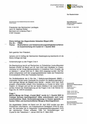 STAATSMINISTERIUM Freistaat DES INNERN SACHSEN Auf Grund eines beim Bundeskriminalamt liegenden technischen Problems ist in der Recherche eine Differenzierung nach Landkreis/Kreisfreier Stadt nicht möglich. Für das 1. Quartal 2022 werden die entsprechenden Zahlen aufgeschlüsselt nach sachbearbei- tender Polizeidirektion (PD) angegeben. Auf Grund von Datensatzaktualisierungen können Abweichungen zu früher veröffent- lichten Werten auftreten. . : Menge Durchschnittliche Dienststelle Fälle (in a) Menge/Fall (in g) PD Dresden 60 771,47 12,8578 PD Chemnitz 57 144,64 2,5375 PD Görlitz 36 71,48 1,9855 PD Leipzig 124 367,10 2,9605 PD Zwickau 31 35,86 1,1567 Landeskriminalamt 4 2,00 2,00 Sachsen Gesamt 309 1.392,55 4,5066 Frage 2: Wie viele Strafverfahren wurden im Zeitraum wie Frage 1 nach § 29 | BtMG in Bezug auf „Crystal Meth“ in Sachsen eingeleitet? (Bitte aufschlüsseln nach Tat- bestand nach Nummern des § 29 | BtMG, Landkreisen/Kreisfreien Städten und Jahr- „Handel treiben“ und „Einfuhrschmuggel“ können bei dieser Frage unbe- rücksichtigt bleiben!) Eingeleitete Ermittlungsverfahren zu Straftaten nach $ 29 Abs. 1 BtMG im Zusammen- hang mit Crystal nach Tatbestand: Anzahl der Fälle Tatbestand Anzeigenerstattung im 1. Quartal 2022 8 29 Abs. 1 Nr. 1 BtMG - unerlaubte Ein-/Ausfuhr von Be- täubungsmitteln — Methamphetamin in kristalliner Form 2 (Crystal) 8 29 Abs. 1 Nr. 1 BtMG - unerlaubter Erwerb, sich verschaf- fen von Betäubungsmitteln — Methamphetamin in kristalli- 129 ner Form (Crystal) § 29 Abs. 1 Nr. 1 BtMG - unerlaubter Handel mit Betau- bungsmitteln — hier Methamphetamin in kristalliner Form 63 (Crystal) § 29 Abs. 1 Nr. 1 BtMG — unerlaubte Herstellung von Be- taubungsmitteln — Methamphetamin in kristalliner Form 1 (Crystal) 8 29 Abs. 1 Nr. 1 BtMG - unerlaubte Veräußerung, Abgabe, in Verkehr bringen von Betäubungsmitteln — Methampheta- 13 min in kristalliner Form (Crystal) Seite 2 von 6