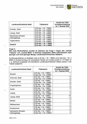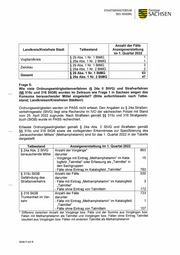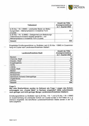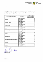 STAATSMINISTERIUM Freistaat DES INNERN SACHSEN Anzahl der Fälle Tatbestand Anzeigenerstattung im 1. Quartal 2022 § 29 Abs. 1 Nr. 3 BtMG - unerlaubter Besitz von Betäu- bungsmitteln — Methamphetamin in kristalliner Form 635 (Crystal) § 29 Abs. 1 Nr. 10 BtMG - Gelegenheit zum Betäubungs- mittelverbrauch/-Erwerb/-Abgabe gewähren — von Methamphetamin in kristalliner Form (Crystal) Gesamt 844 Eingeleitete Ermittlungsverfahren zu Straftaten nach $ 29 Abs. 1 BtMG im Zusammen- hang mit Crystal nach Landkreisen/Kreisfreien Städten: Anzahl der Fälle Landkreis/Kreisfreie Stadt Anzeigenerstattung im 1. Quartal 2022 Bautzen 77 Chemnitz, Stadt 98 Dresden, Stadt 101 Erzgebirgskreis 46 Görlitz 75 Leipzig 33 Leipzig, Stadt 145 Meißen 33 Mittelsachsen 32 Nordsachsen 61 Sächsische Schweiz-Osterzgebirge 36 Vogtlandkreis 49 Zwickau 58 Gesamt 844 Frage 3: Wie viele Strafverfahren wurden im Zeitraum wie Frage 1 wegen des Einfuhr- schmuggels von „Crystal Meth“ in Sachsen eingeleitet? (Bitte aufschlüsseln nach geringer und nicht geringer Menge; Landkreisen/Kreisfreien Städten!) Ermittlungsverfahren zu Straftaten nach § 29 Abs. 1 Nr. 1 und § 30 Abs. 1 Nr. 4 BtMG im Zusammenhang mit unerlaubter Einfuhr von Crystal wurden in fünf Fällen im o. g. Zeitraum eingeleitet. Die betroffenen Landkreise/Kreisfreien Städte werden in der Ta- belle aufgeführt: Seite 3 von 6