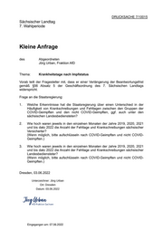 DRUCKSACHE 7/10015 Sächsischer Landtag 7. Wahlperiode Kleine Anfrage des Abgeordneten Jörg Urban, Fraktion AfD Thema: Krankheitstage nach Impfstatus Vorab teilt der Fragesteller mit, dass er einer Verlängerung der Beantwortungsfrist gemäß §56 Absatz 5 der Geschäftsordnung des 7. Sächsischen Landtags widerspricht. Frage an die Staatsregierung: 1. Welche Erkenntnisse hat die Staatsregierung über einen Unterschied in der Häufigkeit von Krankschreibungen und Fehltagen zwischen den Gruppen der COVID-Geimpften und den nicht COVID-Geimpften, ggf. auch unter den sächsischen Landesbediensteten? 2. Wie hoch waren jeweils in den einzelnen Monaten der Jahre 2019, 2020, 2021 und bis dato 2022 die Anzahl der Fehltage und Krankschreibungen sächsischer Versicherter? (Wenn möglich, bitte aufschlüsseln nach COVID-Geimpften und nicht COVID- Geimpften.) 3. Wie hoch waren jeweils in den einzelnen Monaten der Jahre 2019, 2020, 2021 und bis dato 2022 die Anzahl der Fehltage und Krankschreibungen sächsischer Landesbediensteter? (Wenn möglich, bitte aufschlüsseln nach COVID-Geimpften und nicht COVID- Geimpften.) Dresden, 03.06.2022 Unterzeichner: Jörg Urban Ort: Dresden Datum: 03.06.2022 Eingegangen am: 07.06.2022