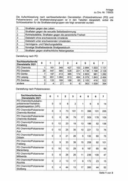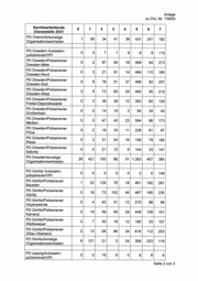 Anlage zu Drs.-Nr. 7/9505 Die Aufschlüsselung nach sachbearbeitenden Dienststellen (Polizeidirektionen [PD] und Polizeirevieren) und Straftatenobergruppen ist in den Tabellen dargestellt, wobei die Schlüsselzahlen für die Straftatenobergruppen wie folgt verwendet wurden: Straftaten gegen das Leben NI9|01|PN RIW| |—-|O Straftaten gegen die sexuelle Selbstbestimmung Rohheitsdelikte, Straftaten gegen die persönliche Freiheit Diebstahl ohne erschwerende Umstände Diebstahl unter erschwerenden Umständen Vermögens- und Fälschungsdelikte Sonstige Straftatbestände Strafgesetzbuch Straftaten gegen strafrechtliche Nebengesetze Darstellung nach PD: Sachbearbeitende Dienststelle 2021 | ° 1 2 ’ 4 6 z PD Chemnitz 161 349 427 153| 2.994| 1.003\ 1.131 PD Dresden 28 447 585 528 221| 4.738| 1.198| 2.129 PD Görlitz 7 197 413 365 174| 2.803 981| 1.282 PD Leipzig 19 651| 1.084 813 494| 6.379| 1.843| 2.494 PD Zwickau 0 133 169 168 65| 2.105 416 522 andere 2 4 27 8 6 363! 1.009 394 Darstellung nach Polizeirevieren: Sachbearbeitende 0 1 2 3 4 5 6 7 Dienststelle 2021 PD Chemnitz/Autobahn- polizeirevier/Verkehrs- 0 0 6 2 1 6 6 14 polizeiinspektion (VPI) PD Chemnitz/Polizeirevier 0 73} 101 1 9 101} 2 Chemnitz-Nordost 4 " ; sala i PD Chemnitz/Polizeirevier 0 8 7 17 9| 17 09 Chemnitz-Südwest n ‘ = = a1 PD Chemnitz/Polizeirevier 0 12 33 19 13 186 52 136 Annaberg PD Chemnitz/Polizeirevier 0 10 25 35 10 221 72 76 Aue PD Chemnitz/Polizeirevier 0 3 21 26 5 132 60 75 Döbeln PD Chemnitz/Polizeirevier 0 9 33 39 15 258 92 101 Freiberg PD Chemnitz/Polizeirevier 0 16 13 29 6 187 65 69 Marienberg PD Chemnitz/Polizeirevier 0 6 26 26 11 236 109 47 Mittweida PD Chemnitz/Polizeirevier 0 2 13 47 9 172 23 15 Rochlitz PD Chemnitz/Polizeirevier 0 4 AA 13 17| 260 44 52 Stollberg Seite 1 von 3
