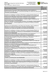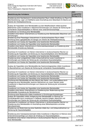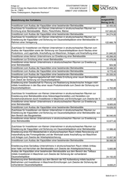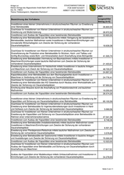 Anlage zur Kleinen Anfrage des Abgeordneten André Barth (AfD-Fraktion) Drs.-Nr.: 7/9812 Thema: Förderprogramm „Regionales Wachstum“ 2021 Bezeichnung des Vorhabens ausgezahlter Betrag (in €) Investitionen eines kleinen Unternehmens in strukturschwachen Räumen zur Erweiterung einer Betriebsstätte 26.800,00 Zuschüsse für Investitionen von Kleinen Unternehmen in strukturschwachen Räumen zur Erweiterung und Modernisierung 28.972,52 Investitionen zum Ausbau der Kapazitäten einer bestehenden Betriebsstätte 33.920,00 Erweiterung einer Betriebsstätte aus der Baubranche mittels Verlagerung der bestehenden Betriebsstätte, baulicher Maßnahmen sowie Investitionen in Maschinen/Einrichtungen und immaterielle Wirtschafstgüter zum Zwecke der Sicherung der vorhandenen Dauerarbeitsplätzen 18.639,38 Zuschüsse für Investitionen von Kleinen Unternehmen in strukturschwachen Räumen zur Diversifizierung der Produktion einer Betriebsstätte für Brücken, Hoch- und Tiefbau und künftig Brunnenbau sowie Bohr- und Ankerarbeiten durch Anschaffung eines Bohrgeräte 41.505,74 Erweiterung einer Betriebsstätte (Vermietung von Baumaschinen) mittels Investitionen in Maschinen/Einrichtungen sowie bauliche Maßnahmen zum Zwecke der Sicherung der vorhandenen Dauerarbeitsplätze 21.403,61 Erweiterung eines Unternehmens für Heiztechnik mittels Investitionen in bauliche Anlagen und Maschinen zum Zweck der Sicherung von Dauerarbeitsplätzen 48.720,27 Investitionen zum Ausbau der Kapazitäten einer bestehenden Betriebsstätte 24.897,00 Kapazitätsausbau einer Betriebsstätte aus dem Bauhauptgewerbe durch Investitionen in Maschinen in Verbindung mit der Sicherung von Dauerarbeitsplätzen 24.776,41 Zuschüsse für Investitionen von Kleinen Unternehmen in strukturschwachen Räumen zur Erweiterung einer Betriebsstätte des KfZ-Gewerkes durch Neubau einer Werkstatthalle zum Zwecke der Sicherung von Dauerarbeitsplätzen 97.950,00 Errichtung einer Brauerei durch die Anschaffung von Produktionstechnik und baulichen Maßnahmen 19.200,00 Investitionen zum Ausbau der Kapazitäten einer bestehenden Betriebsstätte 26.574,30 Investitionen eines kleinen Unternehmens in strukturschwachen Räumen zur Erweiterung der Kapazitäten und Sicherung von Dauerarbeitsplätzen einer Betriebsstätte 85.100,59 Zuschüsse für Investitionen von Kleinen Unternehmen in strukturschwachen Räumen zur Erweiterung einer Betriebsstätte für Ingenieurdienstleistungen durch Investitionen in Hard- und Software zum Zwecke der Sicherung der bestehenden Dauerarbeitsplätze 5.069,56 Zuschüsse für Investitionen von Kleinen Unternehmen in strukturschwachen Räumen zur Erweiterung der Kapazitäten und Sicherung von Dauerarbeitsplätzen einer Betriebsstätte im Rahmen einer Unternehmensübernahme 47.541,38 Investitionen zum Ausbau der Kapazitäten einer bestehenden Betriebsstätte 8.748,36 Erweiterung einer Betriebsstätte (Installationsbetrieb) mittels baulicher Maßnahmen sowie Investitionen in Maschinen/Einrichtungen zum Zwecke der Sicherung der vorhandenen Dauerarbeitsplätze 6.501,40 Erweiterung einer Pferdepension/Reitschule mittels baulicher Maßnahmen zum Zwecke der Sicherung der vorhandenen Dauerarbeitsplätze 3.576,60 Erweiterung einer Betriebsstätte der Gastronomie mittels Investitionen in bauliche Anlagen und Ausstattungen zum Zwecke der Sicherung von Dauerarbeitsplätzen 75.000,00 Investitionen zum Ausbau der Kapazitäten einer bestehenden Betriebsstätte 12.523,50 Zuschüsse für Investitionen von Kleinen Unternehmen in strukturschwachen Räumen zum Ausbau der Kapazitäten einer Betriebsstätte und Sicherung von Dauerarbeitsplätzen durch Anschaffung von Maschinen 17.817,01 Ausbau der Kapazitäten einer Modeboutique mittels Umbaumaßnahmen und Investitionen in Einrichtungen zum Zwecke der Sicherung der vorhandenen Dauerarbeitsplätze 34.278,93 Seite 2 von 11