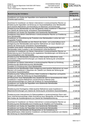 Anlage zur Kleinen Anfrage des Abgeordneten André Barth (AfD-Fraktion) Drs.-Nr.: 7/9812 Thema: Förderprogramm „Regionales Wachstum“ 2021 Bezeichnung des Vorhabens ausgezahlter Betrag (in €) Investitionen zum Ausbau der Kapazitäten einer Betriebsstätte - im Rahmen einer Unternehmensnachfolge 21.229,59 Zuschüsse für Investitionen von Kleinen Unternehmen in strukturschwachen Räumen zur Erweiterung der Kapazitäten und Sicherung von Dauerarbeitsplätzen einer Betriebsstätte im Rahmen einer Verlagerung 99.480,00 Investitionen von Kleinen Unternehmen in strukturschwachen Räumen zur Errichtung, Erweiterung oder Modernisierung einer Betriebsstätte 10.139,94 Zuschüsse für Investitionen von Kleinen Unternehmen in strukturschwachen Räumen zur Erweiterung einer Betriebsstätte mit Investition in die Neugstaltung der Geschäftsräume und Anschaffung neuer Soft- und Hardware 3.007,41 Erweiterung einer Werbeagentur mittels Umbaumaßnahmen und Investitionen in Maschinen/Einrichtung und immaterielle Wirtschaftsgüter zum Zwecke der Sicherung der vorhandenen DAP 6.748,32 Modernisierung einer Betriebsstätte mittels baulicher Investitionen und Maschineninvestitionen zum Zwecke der Sicherung von Dauerarbeitsplätzen 14.760,56 Investitionen zum Ausbau der Kapazitäten einer bestehenden Betriebsstätte 16.410,00 Erweiterung einer Betriebsstätte aus dem Bereich der Dachdeckerei und Zimmerei mittels Investitionen in Maschinen/Einrichtungen zum Zwecke der Sicherung der vorhandenen Dauerarbeitsplätze 49.500,00 Investition zur Errichtung einer neuen Betriebsstätte 39.041,94 Zuschüsse für Investitionen von Kleinen Unternehmen in strukturschwachen Räumen zur Erweiterung der Kapazitäten und Sicherung von Dauerarbeitsplätzen einer Betriebsstätte im Rahmen einer Verlagerung 72.748,09 Investitionen eines kleinen Unternehmen in strukturschwachen Räumen zur Errichtung einer Betriebsstätte 18.536,00 Zuschüsse für Investitionen von Kleinen Unternehmen in strukturschwachen Räumen zur Errichtung einer Betriebsstätte mit Einrichtung einer Produktionshalle und Anschaffung einer neuen Kantenanleimmaschine 13.684,54 Investitionen zum Ausbau der Kapazitäten einer bestehenden Betriebsstätte 20.601,00 Investitionsmaßnahme eines kleinen Unternehmens des Dachdeckerhandwerks zur Erweiterung einer Betriebsstätte (Hallenneubau mit Maschineninvestition) 7.691,69 Erweiterung einer Betriebsstätte mittels Errichtung einer Halle zum Zwecke der Sicherung der vorhandenen Dauerarbeitsplätze 128.250,00 Zuschüsse für Investitionen von Kleinen Unternehmen in strukturschwachen Räumen zur Erweiterung einer Betriebsstätte mit Ausbau Büro- und Sozialräume sowie Geräteanschaffung 13.024,88 Erweiterung eines Maler- und Kettelbetriebs mittels Investitionen in bauliche Anlagen und Maschinen im Rahmen einer Unternehmensnachfolge zum Zweck der Sicherung von Dauerarbeitsplätzen. 45.893,98 Investitionen zum Ausbau der Kapazitäten einer bestehenden Betriebsstätte 22.680,00 Investitionen in bauliche Maßnahmen und Maschinen zur Sicherung von Dauerarbeitsplätzen 14.773,21 Zuschüsse für Investitionen von Kleinen Unternehmen in strukturschwachen Räumen zur Erweiterung der Kapazitäten und Sicherung von Dauerarbeitsplätzen einer Betriebsstätte 14.940,00 Erweiterung eines Unternehmens für Garten- und Landschaftsbau mittels Investition in eine Lagerhalle zum Zweck der Sicherung von Dauerarbeitsplätzen 16.562,75 Investition eines Kleinen Unternehmens in strukturschwachen Räumen zur Sicherung von Dauerarbeitsplätzen durch Neubau einer Betriebsstätte im Rahmen einer Verlagerung 50.752,94 Seite 6 von 11