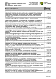 Anlage zur Kleinen Anfrage des Abgeordneten André Barth (AfD-Fraktion) Drs.-Nr.: 7/9812 Thema: Förderprogramm „Regionales Wachstum“ 2021 Bezeichnung des Vorhabens ausgezahlter Betrag (in €) Investitionen zum Ausbau der Kapazitäten einer bestehenden Betriebsstätte (Erweiterungsinvestition) 26.250,00 Zuschüsse für Investitionen von Kleinen Unternehmen in strukturschwachen Räumen zur Erweiterung der Kapazitäten und Sicherung von Dauerarbeitsplätzen einer Betriebsstätte durch bauliche Maßnahmen und Anschaffung von Maschinen und Einrichtungen 62.695,89 Erweiterung einer Betriebsstätte aus dem Baugewerbe mittels Investitionen in Maschinen zum Zwecke der Sicherung der vorhandenen Dauerarbeitsplätzen 1.216,94 Investitionen zum Ausbau der Kapazitäten einer bestehenden Betriebsstätte 7.457,17 Investitionen eines kleinen Unternehmens in strukturschwachen Räumen zur Erweiterung einer Betriebsstätte 3.506,06 Investitionen zur Diversifizierung der Produktion einer Betriebsstätte in vorher dort nicht hergestellte Produkte 9.600,00 Errichtung einer Betriebsstätte aus dem Bereich des Garten- und Landschaftbaus durch Verlagerung einer Betriebsstätte sowie baulicher Maßnahmen am neuen Standort zum Zwecke der Sicherung der vorhandenen Dauerarbeitsplätze 89.027,62 Investition eines kleinen Unternehmens zur Verbesserung der Angebotsqualität einer Betriebsstätte mittels Investition in den Küchenbereich sowie Brandschutz 59.871,78 Zuschüsse für Investitionen von Kleinen Unternehmen in strukturschwachen Räumen zur Modernisierung durch Diversifizierung der angebotenen Dienstleistungen und Sicherung von Dauerarbeitsplätzen einer Betriebsstätte 100.000,00 Erweiterung einer Betriebsstätte (Kanalservice) mittels baulicher Maßnahmen sowie Investitionen in Maschinen/Einrichtungen zum Zwecke der Sicherung der vorhandenen Dauerarbeitsplätze 22.603,30 Investitionen von Kleinen Unternehmen in strukturschwachen Räumen zur Errichtung, Erweiterung oder Modernisierung einer Betriebsstätte 15.496,99 Investition zur Errichtung einer neuen Betriebsstätte 31.661,18 Erweiterung einer Betriebsstätte mittels Verlagerung sowie baulicher Maßnahmen am neuen Standort und Investitionen in Maschinen inkl. Zubehör zum Zwecke der Sicherung der vorhandenen Dauerarbeitsplätze 11.361,56 Erweiterung eines Tiefbauunternehmens mittels Investitionen in Maschinen und bauliche Anlagen zum Zweck der Sicherung von Dauerarbeitsplätzen 22.288,87 Errichtung einer neuen Betriebsstätte einer Gesellschaft mbH für Sicherheitstechnik mittels Investitionen in bauliche Maßnahmen und Einrichtung im Rahmen einer Unternehmensnachfolge zum Zweck der Erhaltung von Dauerarbeitsplätzen 147.700,00 Investitionen zum Ausbau der Kapazitäten einer bestehenden Betriebsstätte (Erweiterungsinvestition) 6.532,50 Erweiterung einer Eventagentur mittels baulicher Maßnahmen sowie Investitionen in Maschinen/Einrichtungen zum Zwecke der Sicherung der vorhandenen Dauerarbeitsplätze 27.627,82 Erweiterung eines Unternehmens für Elektroinstallation in strukturschwachem Raum nach einer Unternehmensnachfolge mittels Anschaffung neuer Messgeräte und Werkzeuge sowie dem Ausbau der Ausstellungsräume zum Zwecke der Arbeitsplatzsicherung 8.685,54 Zuschüsse für Investitionen von Kleinen Unternehmen in strukturschwachen Räumen zur Erweiterung einer Betriebsstätte durch Erweiterung der Sitzplätze und Frontcooking 89.200,00 Investitionen zum Ausbau der Kapazitäten einer bestehenden Betriebsstätte 37.300,00 Investitionen zum Ausbau der Kapazitäten einer bestehenden Betriebsstätte 34.967,97 Erweiterung einer Betriebsstätte des Baugewerbes um die Aufarbeitung von Betonabfallmassen mittels baulicher Investitionen und Maschineninvestitionen zum Zwecke der Sicherung von Dauerarbeitsplätzen 12.960,37 Seite 3 von 11