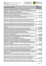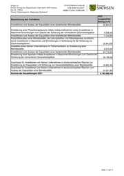 Anlage zur Kleinen Anfrage des Abgeordneten André Barth (AfD-Fraktion) Drs.-Nr.: 7/9812 Thema: Förderprogramm „Regionales Wachstum“ 2021 Bezeichnung des Vorhabens ausgezahlter Betrag (in €) Investitionen zum Ausbau der Kapazitäten einer bestehenden Betriebsstätte (Erweiterungsinvestition) 18.284,59 Erweiterung einer Apotheke in strukturschwachem Raum mittels Ausbau und Einrichtung neuer Geschäftsräume zum Zwecke der Arbeitsplatzsicherung 24.727,53 Zuschüsse für Investitionen von Kleinen Unternehmen in strukturschwachen Räumen zur Erweiterung einer Betriebsstätte der Be- und Verarbeitung von Naturwerkstein und Natursteinen zum Zwecke der Sicherung der Dauerarbeitsplätze 20.786,52 Errichtung eines Schlachthauses mittels baulicher Maßnahmen und Investitionen in Maschinen/Einrichtungen zum Zwecke der Sicherung der vorhandenen Dauerarbeitsplätze 26.791,74 Errichtung einer Dachdeckerei und Zimmerei in strukturschwachem Raum mittels Anschaffung eines Anhängerkrans und einer hydraulischen Abkantbank zum Zwecke der Arbeitsplatzsicherung 6.592,28 Investitionen zum Ausbau der Kapazitäten einer bestehenden Betriebsstätte 25.633,18 Investitionen zum Ausbau der Kapazitäten einer bestehenden Betriebsstätte 47.598,08 Zuschüsse für Investitionen von Kleinen Unternehmen in strukturschwachen Räumen zur Erweiterung der Kapazitäten und Sicherung von Dauerarbeitsplätzen einer Betriebsstätte 12.794,88 Erweiterung eines Stahlbauunternehmens in strukturschwachem Raum mittels Anschaffung neuer Maschinen zum Zwecke der Arbeitsplatzsicherung 11.187,13 Erweiterung eines Ingenieurbüros mittels Investitionen in den Neubau eines Bürogebäudes und neuer Software zum Zweck der Sicherung von Dauerarbeitsplätzen. 45.267,35 Investitionen zum Ausbau der Kapazitäten einer bestehenden Betriebsstätte 48.919,50 Zuschüsse für Investitionen von Kleinen Unternehmen in strukturschwachen Räumen zur Erweiterung einer Betriebsstätte für Herstellung, Handel und Service von Fahrrädern durch bauliche Erweiterung der Betriebsstätte zum Zwecke der Sicherung der bestehenden 29.800,00 Investitionen eines kleinen Unternehmens in strukturschwachen Räumen zur Errichtung einer Betriebsstätte 46.636,02 Errichtung einer Betriebsstätte des Klempnergewerbes mittels Investitionen in den Umbau und die Einrichtung einer Halle sowie die Anschaffung von Werkzeugen und Messtechnik zum Zwecke der Schaffung neuer Dauerarbeitsplätze 7.069,37 Investitionen zum Ausbau der Kapazitäten einer bestehenden Betriebsstätte 51.570,00 Erweiterung eines Unternehmens für moderne Haustechnik mittels Investitionen in bauliche Anlagen und Maschinen zum Zweck der Sicherung von Dauerarbeitsplätzen 26.818,98 Erweiterung einer Betriebsstätte für Naturstein- und Steinmetzarbeiten durch Errichtung eines Anbaus an die bestehende Immobilie sowie Investitionen in Maschinen, Ausstattung und immaterielle Wirtschaftsgüter zum Zwecke der Sicherung der bestehenden Dauer 102.162,21 Zuschüsse für Investitionen von Kleinen Unternehmen in strukturschwachen Räumen zur Errichtung durch Verlagerung einer Betriebsstätte für Wartung, Montage und Handel von und mit Brandschutzartikeln und -geräten durch bauliche Investitionen und Anschaffung 75.366,70 Erweiterung einer Physiotherapiepraxis durch Verlagerung der bestehenden Praxis in eine neu zu errichtende Betriebsstätte im Rahmen einer Unternehmensnachfolge zum Zwecke der Sicherung der vorhandenen Dauerarbeitsplätze 138.648,30 Erweiterung einer Betriebsstätte aus dem Bereich der Landschaftsgestaltung mittels Investitionen in Maschinen zum Zwecke der Sicherung der vorhandenen Dauerarbeitsplätze 114.600,00 Investition zur Errichtung einer neuen Betriebsstätte zur Herstellung und Verkauf von Speiseeis mittels Neubau einer Eismanufaktur samt Ausstattung und Einrichtung zum Zwecke der Sicherung der vorhandenen Dauerarbeitsplätze 72.654,16 Seite 9 von 11