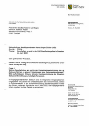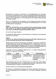STAATSMINISTERIUM Freistaat DES INNERN SACHSEN Rechtsaufsicht, nicht aber der Fachaufsicht. Im Zuständigkeitsbereich der Rechtsauf- sicht können die Staatsregierung bzw. die damit beauftragten Rechtsaufsichtsbehörden vom Informationsrecht nach $ 113 Sächsische Gemeindeordnung nur dann Gebrauch machen, wenn Anhaltspunkte für eine bevorstehende oder erfolgte Rechtsverletzung im Einzelfall vorliegen. Dies ist im vorliegenden Fall nicht gegeben, denn das begehrte pauschale Auskunfts- verlangen der Aufsichtsbehörde nach Einsätzen des Rettungsdienstes ist vom Institut der Rechtsaufsicht nicht gedeckt. Frage 2: Gegen wie viele Bewohner und aus welchem Grund wurde/wird aktuell ermittelt bzw. wurden im 0.g. Zeitraum Anzeigen erstattet? Bitte aufschlüsseln (Tatvor- wurf, Einzel- oder Wiederholungstat, Herkunftsland, Datum). Es wird auf die Anlage verwiesen. Die aufgeführten Daten basieren auf einer Recherche im Polizeilichen Auskunftssystem Sachsen vom 5. Mai 2022. Frage 3: Fanden im o.g. Zeitraum Zimmerdurchsuchungen statt? Bitte aufschlüsseln (Da- tum der Durchsuchung, Grund, Funde, Konsequenzen). Werden durch die Polizei Durchsuchungen durchgeführt, sind diese zu protokollieren. Die Nachweisführung, als auch die Protokollierung, kann in elektronischer Form im In- tegrierten Vorgangsbearbeitungssystem (IVO) bzw. auch mit vorgefertigten handschrift- lichen Formularen erfolgen. Im letztgenannten Fall erfolgt nicht zwingenderweise eine nachträgliche Einarbeitung/Erhebung im IVO als elektronischer Nachweis. Recherchen im IVO im angefragten Zeitraum zum o. g. Objekt (Gebäude/Zimmer) ergaben eine registrierte Durchsuchung. Datum Grund Fund Konsequenzen 02.04.2022| Sicherstellung von Flaschenöffner mit | Sicherstellung des Beweis- Beweismitteln gem. | versteckter Klinge | mittels; Einleitung Ermitt- § 94 Strafprozess- lungsverfahren — Verstoß ordnung 8 52 Absatz 1 Nr. 1 Waf- fengesetz Diese Erkenntnis basiert auf einer IVO-Recherche vom 5. Mai 2022, welche strafpro- zessuale (Strafprozessordnung) und gefahrenabwehrrechtliche (Sächsisches Polizei- vollzugsdienstgesetz) Vorgänge und Maßnahmen beinhaltete. Darüber hinaus wird von einer Beantwortung abgesehen. Die weiteren zur vollständigen Beantwortung der Frage notwendigen Erkenntnisse lie- gen der Staatsregierung nicht unmittelbar vor. Sie müssten aufwendig recherchiert werden. Seite 3 von 5