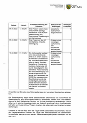 STAATSMINISTERIUM Freistaat DES INNERN SACHSEN : Kurzbeschreibung der Status der Er- | Beteiligte eenun Shraeit Situation mittlungen Personen 05.04.2022 | 17:29 Uhr | Eine Person, welche medi- |- polizeiliche 1 zinische Hilfe benötigt, Maßnahmen meldet sich in der Aufnah- abgeschlossen meeinrichtung (AE). Es erfolgt die Einweisung in ein Krankenhaus. 06.04.2022 | 18:18 Uhr | Eine Person vor der AE - Anlegen eines 1 benötigt eine Anlaufbe- „Sonstigen scheinigung. Vorkommnis- ses" - polizeiliche Maßnahmen abgeschlossen 16.04.2022 | 01:11 Uhr | Ein Asylbewerber verlässt |- Anlegen eines 1 ohne bekannte Gründe „Sonstigen eine AE in einem anderen Vorkommnis- Bundesland und beabsich- ses“ tigt, ohne Anlaufbescheini- |- polizeiliche gung in die AE Stauffen- Maßnahmen bergallee in Dresden ein- abgeschlossen zuziehen. Seitens der AE wurde dies abgelehnt. Die betroffene Person beharrte auf eine Unterbringung und störte die Nachtruhe. Ihr wurde ein Platzverweis bis 06:00 Uhr ausgesprochen. Des Weiteren wurde die zuständige Ausländerbe- hörde über den aktuellen Aufenthaltsort der betroffe- nen Person in Kenntnis gesetzt. Hinsichtlich der Einsätze des Rettungsdienstes wird von einer Beantwortung abgese- hen. Der Staatsregierung liegen keine entsprechenden Erkenntnisse vor. Eine Pflicht der Staatsregierung, sich die erfragten Daten zu verschaffen, besteht nicht. Die Staatsre- gierung ist dem Sächsischen Landtag nur für ihre Amtsführung verantwortlich. Sie ist daher nur in solchen Angelegenheiten zur Auskunft verpflichtet, die in ihre Zuständig- keit fallen und muss nicht auf Fragen eingehen, die außerhalb ihres Verantwortungsbe- reichs liegen. Letzteres ist hier der Fall, denn die Frage betrifft ausschließlich Sachverhalte, die von der Landeshauptstadt Dresden als Träger des Rettungsdienstes als Selbstverwal- tungsaufgabe wahrgenommen werden. Selbstverwaltungsaufgaben unterliegen nur der Seite 2 von 5