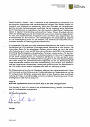 STAATSMINISTERIUM | Freistaat DESINNERN | SACHSEN Gemäß Artikel 51 Absatz 1 Satz 1 SächsVerf ist die Staatsregierung verpflichtet, Fra- gen einzelner Abgeordneter oder parlamentarische Anfragen nach bestem Wissen un- verzüglich und vollständig zu beantworten. Nach dem Grundsatz der Verfassungsor- gantreue ist jedes Verfassungsorgan verpflichtet, bei der Ausübung seiner Befugnisse den Funktionsbereich zu respektieren, den die hierdurch mitbetroffenen Verfassungs- organe in eigener Verantwortung wahrzunehmen haben. Dieser Grundsatz gilt zwi- schen der Staatsregierung und dem Parlament sowie seinen einzelnen Abgeordneten, so dass das parlamentarische Fragerecht durch die Pflicht des Abgeordneten zur Rücksichtnahme auf die Funktions- und Arbeitsfähigkeit der Staatsregierung begrenzt ist. Die Staatsregierung muss nur das mitteilen, was innerhalb der Antwortfrist mit zu- mutbarem Aufwand in Erfahrung gebracht werden kann. Im vorliegenden Fall wäre durch eine vollständige Beantwortung die Arbeits- und Funk- tionsfähigkeit der LDS gefährdet. Eine elektronische Recherche ist nicht möglich. Die notwendigen Daten für den abgefragten Zeitraum können daher nur durch die händi- sche Auswertung von mehr als 400 Akten der im Zeitraum April 2022 in der Aufnahme- einrichtung Stauffenbergallee untergebrachten Personen erlangt werden. Für das Her- aussuchen, die Auswertung der Akten und Dokumentation im Sinne der Fragestellung ist von einem Arbeitsaufwand von mindestens 30 Minuten je Akte und damit einem Zeitaufwand mindestens 200 Arbeitsstunden auszugehen. Auch unter Berücksichtigung des hohen Rangs des parlamentarischen Fragerechts ist der zur Beantwortung der Frage erforderliche Aufwand nicht mehr verhältnismäßig und zumutbar. Eine Beantwor- tung der Frage würde in erheblichem Umfang eine größere Anzahl von Bediensteten in der LDS binden, die für andere Tätigkeiten nicht mehr zur Verfügung stünden. Die Staatsregierung kam bei der Abwägung zwischen dem parlamentarischen Frage- recht einerseits und der Sicherung der Funktionsfähigkeit der Staatsregierung und der ihr nachgeordneten Behörden andererseits daher zu dem Ergebnis, dass eine Beant- wortung der Frage unverhältnismäßig und ohne erhebliche Einschränkung der Funkti- onsfähigkeit der LDS nicht zu leisten ist. Frage 5: Wie viele Asylbewerber waren am 30.04.2022 in der EAE untergebracht? Zum Stichtag 30. April 2022 waren in der Aufnahmeeinrichtung Dresden, Stauffenberg- allee 303 Asylbewerber untergebracht. Mit freundliche üßen _ A HM Armin Schuster Anlage Seite 5 von 5