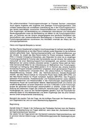 STAATSMINISTERIUM Freistaat FÜR WISSENSCHAFT SACHSEIN KULTUR UND TOURISMUS Die außeruniversitären Forschungseinrichtungen im Freistaat Sachsen unterstützen durch eigene Angebote oder Angebote ihrer jeweiligen Forschungsorganisation. Dies umfasst insbesondere die unmittelbare Unterstützung der in den Forschungseinrichtun gen bereits beschäftigten ukrainischen Wissenschaftlerinnen und Wissenschaftler und ihrer Angehörigen, die Bereitstellung von umfassenden Informationen und individuellen Beratungsangeboten sowie die Bereitstellung von Mitteln für die Forschungseinrichtun gen, um Personen aus der Ukraine übergangsweise eine berufliche Perspektive (wis senschaftliche oder wissenschaftsnahe Beschäftigung) in Deutschland zu bieten. Die Forschungsorganisationen koordinieren ihre Aktivitäten innerhalb der Allianz der For schungsorganisationen. Hierzu sind folgende Beispiele zu nennen; Die Max-Planck-Gesellschaft ermöglicht Anschlussverträge für befristet beschäftigte uk rainische Mitarbeitende an den Max-Planck-Instituten sowie Stipendien für die Aufnahme weiterer geflüchteter Gast-, Nachwuchswissenschaftler und -Wissenschaftlerinnen aus der Ukraine. So vergibt das Max-Planck-Institut für Physik komplexer Systeme (MPI- PKS) in Dresden Emergency-Fellowships, also Stipendien für einen bis zu einjährigen Forschungsaufenthalt für Forscher aller Karrierestufen aus der Ukraine. Die Leibniz-Ge- meinschaft hat einen Matching-Support-Fond bereitgestellt, aus welchem individuelle Maßnahmen der Leibniz-Institute unterstützt werden. In gleicherweise stellt die Helm- holtz-Gemeinschaft Mittel für die Unterstützung von Maßnahmen ihrer Forschungsein richtungen zur Verfügung. Diese Mittel werden z. B. Im Rahmen des „Ukraine Scientific Scholarship Program Dresden (UKRAPRO)" eingesetzt, einem gemeinsamen Programm der Kiewer Akademischen Universität (KAU), des Leibniz-Instituts für Festkörper und Werkstoffforschung Dresden (IFW), des Helmholtz-Zentrums Dresden-Rossendorf (HZDR), des Max-Planck-Instituts für Chemische Physik fester Stoffe (MPI-CPfS) und des Max-Planck-Instituts für Physik komplexer Systeme (MPI-PKS). Das Programm adressiert Promovierende, Postdoktoranden und Postdoktorandinnen sowie etablierte Wissenschaftlerinnen und Wissenschaftler in den Fachrichtungen experimentelle und theoretische Physik der kondensierten Materie, Materialwissenschaft und Chemie und schafft die Möglichkeit, mit einem Stipendium von 6 bis 12 Monaten in einer Forschungs gruppe der genannten Einrichtungen wissenschaftlich zu arbeiten. Zudem wird Unter stützung bei praktischen Fragen wie Unterkunft, Versicherungen, Bankgeschäften, Be hördengängen etc. (auch für die Familienmitglieder) gewährt. Auch die Fraunhofer-Ge sellschaft leistet für ihre Mitarbeitenden und deren Angehörige über die pme Familien service GmbH entsprechende Unterstützung. Bezüglich des zweiten Teils der Frage, der die künftigen Planungen der Staatsregierung zum Gegenstand hat, wird von einer Beantwortung abgesehen. Begründung: Gemäß Artikel 51 Absatz 2 der Verfassung des Freistaates Sachsen kann die Staatsre gierung die Beantwortung von Fragen ablehnen, wenn diese den „Kernbereich exekuti ver Eigenverantwortung" berühren. Der zweite Teil der Frage berührt den Kernbereich exekutiver Eigenverantwortung, weil er auf einen internen Abstimmungs- und Willensbildungsprozess der Staatsregierung ab zielt. Seite 3 von 5