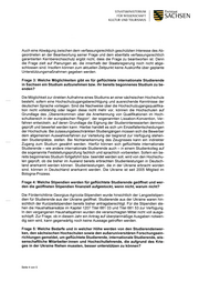 STAATSMINISTERIUM Freistaat FÜR WISSENSCHAFT SACHSEIN KULTUR UND TOURISMUS Auch eine Abwägung zwischen dem verfassungsrechtlich geschützten Interesse des Ab geordneten an der Beantwortung seiner Frage und dem ebenfalls verfassungsrechtlich garantierten Kernbereichsschutz ergibt nicht, dass die Frage zu beantworten ist. Denn die Frage zielt auf Planungen ab, die innerhalb der Staatsregierung noch nicht abge schlossen sind. Insofern können zum aktuellen Zeitpunkt keine Auskünfte über geplante Unterstützungsmaßnahmen gegeben werden. Frage 3: Welche Möglichkelten gibt es für geflüchtete internationale Studierende in Sachsen ein Studium aufzunehmen bzw. ihr bereits begonnenes Studium zu be enden? Die Möglichkeit zur direkten Aufnahme eines Studiums an einer sächsischen Hochschule besteht, sofern eine Hochschulzugangsberechtigung und ausreichende Kenntnisse der deutschen Sprache vorliegen. Sind die Nachweise über die Hochschulzugangsqualifika- tion nicht vollständig oder liegen diese nicht mehr vor, können die Hochschulen auf Grundlage des „Übereinkommen über die Anerkennung von Qualifikationen im Hoch schulbereich in der europäischen Region", der sogenannten Lissabon-Konvention, Ver fahren entwickeln, auf deren Grundlage die Eignung der Studieninteressierten dennoch geprüft und bewertet werden kann. Hierbei handelt es sich um Einzelfallentscheidungen der Hochschule. Bei zulassungsbeschränkten Studiengängen müssen sich die Bewerber dem allgemeinen Auswahlverfahren zur Verteilung der begrenzt zur Verfügung stehen den Studienplätze, stellen. Bei Nichtanerkennung des Zeugnisses kann ein indirekter Zugang zum Studium gewährt werden. Hierfür können sich geflüchtete internationale Studierende - wie andere internationale Studierende auch - in einem Studienkolleg auf die sogenannte Feststellungsprüfung fachlich und sprachlich vorbereiten. Sofern ein be reits begonnenes Studium fortgeführt bzw. beendet werden soll, wird von den Hochschu len geprüft, ob die bisher im Ausland bereits erbrachten Studienleistungen in Deutsch land anerkannt werden können. Studienleistungen, die in der Ukraine erbracht worden sind, können in Deutschland anerkannt werden. Die Ukraine ist seit 2005 Mitglied im Bologna-Prozess. Frage 4: Welche Stipendien werden für geflüchtete Studierende geöffnet und wer den die geöffneten Stipendien finanziell aufgestockt, wenn nicht, warum nicht? Die Förderrichtlinie Georgius-Agricola-Stipendien wurde hinsichtlich der Langzeitstipen dien für Studierende aus der Ukraine geöffnet. Studierende aus der Ukraine waren hin sichtlich der Kurzzeitstipendien bereits bisher antragsberechtigt. Für die Stipendien ste hen die Haushaltsansätze im Kapitel 1207 Titel 681 03 und Titel 681 53 zur Verfügung. In den vergangenen Haushaltsjahren wurden die veranschlagten Mittel nicht voll ausge schöpft. Zur Frage, ob in diesem Jahr ein Antrag auf überplanmäßige Ausgaben notwen dig sein wird, kann gegenwärtig noch keine Aussage getroffen werden. Frage 5: Welche Bedarfe und in welcher Höhe werden von den Studierendenwer ken, den sächsischen Hochschulen sowie den außeruniversitären Forschungsein richtungen gemeldet, um geflüchtete Studierende, internationale Studierende, wis senschaftliche Mitarbeiterinnen und Hochschullehrende, die aufgrund des Krie ges in der Ukraine fliehen mussten, besser unterstützen zu können? Seite 4 von 5