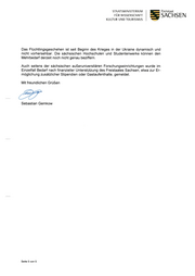 STAATSMINISTERIUM Freistaat FÜR WISSENSCHAFT SACHSEN KULTUR UND TOURISMUS Das Flüchtlingsgeschehen ist seit Beginn des Krieges in der Ukraine dynamisch und nicht vorhersehbar. Die sächsischen Hochschulen und Studentenwerke können den Mehrbedarf derzeit noch nicht genau beziffern. Auch seitens der sächsischen außeruniversitären Forschungseinrichtungen wurde im Einzelfall Bedarf nach finanzieller Unterstützung des Freistaates Sachsen, etwa zur Er möglichung zusätzlicher Stipendien oder Gastaufenthalte, gemeldet. Mit freundlichen Grüßen Sebastian Gemkow Seite 5 von 5