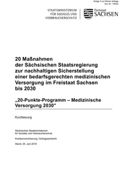 Anlage 3 zur Kleinen Anfrage Drs.-Nr.: 7/9332 20 Maßnahmen der Sächsischen Staatsregierung zur nachhaltigen Sicherstellung einer bedarfsgerechten medizinischen Versorgung im Freistaat Sachsen bis 2030 „20-Punkte-Programm – Medizinische Versorgung 2030" Kurzfassung Sächsisches Staatsministerium für Soziales und Verbraucherschutz Krankenversicherung, Vertragsarztrecht Stand: 25. Juni 2019