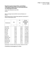 Anlage 1 zur Kleinen Anfrage Drs.-Nr.: 7/9744 Regelleistungsberechtigte (RLB), erwerbsfähige Leistungsberechtigte (ELB) und Zahlungsansprüche von Bedarfsgemeinschaften Leipzig, Stadt (Gebietsstand Januar 2022) Zeitreihe Daten zu Leistungen nach dem SGB II nach einer Wartezeit von 3 Monaten. Datenrevisionen können zu Abweichungen gegenüber Auswertungen mit früherem Erstellungsdatum führen. dar. Zahlungs- ansprüche von RLB Bedarfsgemein- Berichtsmonat ELB schaften in Euro 1 2 3 Januar 2021 55.573 41.492 30.792.062 Februar 2021 56.242 42.089 31.389.451 März 2021 56.635 42.393 32.031.887 April 2021 56.123 42.152 31.416.114 Mai 2021 55.546 41.702 31.133.687 Juni 2021 54.796 41.140 30.634.595 Juli 2021 53.797 40.363 30.135.264 August 2021 53.086 39.798 29.860.905 September 2021 52.293 39.124 29.459.006 Oktober 2021 51.224 38.227 28.964.665 November 2021 50.473 37.582 28.416.384 Dezember 2021 49.951 37.213 28.112.563 Januar 2022 49.745 37.136 28.145.211 Erstellungsdatum: 05.05.2022, Statistik-Service Südost, Auftragsnummer 329162 © Statistik der Bundesagentur für Arbeit