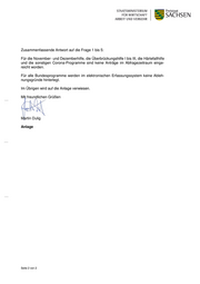 Zusammenfassende Antwort auf die Frage 1 bis 5: Für die November- und Dezemberhilfe, die Überbrückungshilfe I bis III, die Härtefallhilfe und die sonstigen Corona-Programme sind keine Anträge im Abfragezeitraum einge- reicht worden. Für alle Bundesprogramme werden im elektronischen Erfassungssystem keine Ableh- nungsgründe hinterlegt. Im Übrigen wird auf die Anlage verwiesen. Mit freundlichen Grüßen Martin Dulig Anlage Seite 2 von 2