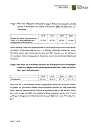 ~SACHsEN STAATSMlNlSTERlUM DER FINANZEN Frage 1: Wie viele erfolgreiche Einsprüche gegen Einkommenssteuerbescheide gab es in den letzten vier Jahren in Sachsen? (Bitte für jedes Jahr auf- schlüsseln.) 2018 2019 2020 2021 Anzahl der bisher ergangenen Ab- hilfen zu in dem jeweiligen Jahr 51 .535 50.795 52.385 50.664 eingegangenen Einsprüchen Abhilfe bedeutet, dass dem (gegebenenfalls im laufe des Einspruchsverfahrens einge- schränkten) Einspruchsantrag bis zum o. g. Stichtag vollständig entsprochen wurde. Die Werte werden sich insbesondere für das Jahr 2021 erhöhen , weil ein Teil der in den jeweiligen Jahren eingegangenen Einsprüche noch nicht abschließend bearbeitet worden ist. Frage 2: Wie hoch ist im Freistaat Sachsen die Erfolgsquote eines eingelegten Einspruchs gegen einen Einkommenssteuerbescheid? (Bitte für die letz- ten 4 Jahre aufschlüsseln.) 2018 2019 2020 2021 Abhilfequote 62,9 % 64,0 % 57 ,1 % 71,4 % Die Anzahl der in den jeweiligen Jahren eingegangenen Einsprüche wurde ins Verhält- nis gesetzt zur Anzahl der in diesen Jahren ergangenen Abhilfen und zwar unabhängig davon , wann die diesbezüglichen Einsprüche eingegangen waren . Nur auf diese Weise kann auch für das Jahr 2021 eine realistische Quote angegeben werden (vgl. Antwort auf Frage 1). Wegen der erhöhten Quote für das Jahr 2021 siehe auch Antwort zu Fra- ge 3. Seite 2 von 4