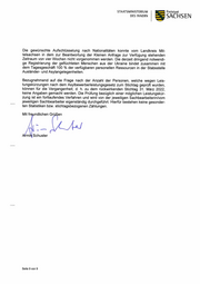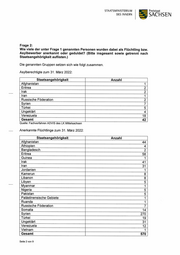 STAATSMINISTERIUM Freistaat DES INNERN SACHSEN Die gewünschte Aufschlüsselung nach Nationalitäten konnte vom Landkreis Mit- telsachsen in dem zur Beantwortung der Kleinen Anfrage zur Verfügung stehenden Zeitraum von vier Wochen nicht vorgenommen werden. Die derzeit dringend notwendi- ge Registrierung der geflüchteten Menschen aus der Ukraine bindet zusammen mit dem Tagesgeschäft 100 % der verfügbaren personellen Ressourcen in der Stabsstelle Ausländer- und Asylangelegenheiten. Bezugnehmend auf die Frage nach der Anzahl der Personen, welche wegen Leis- tungskürzungen nach dem Asylbewerberleistungsgesetz zum Stichtag geprüft wurden, können für die Vergangenheit, d. h. zu dem rückwirkenden Stichtag 31. März 2022, keine Angaben gemacht werden. Die Prüfung bezüglich einer möglichen Leistungskür- zung ist ein fortlaufendes Verfahren und wird von der jeweiligen Sachbearbeiterin/vom jeweiligen Sachbearbeiter eigenständig durchgeführt. Hierfür bestehen keine gesonder- ten Statistiken bzw. stichtagsbezogenen Zählungen. Mit freundlichen Grüßen ~ VLAst mini Schuster Seite 9 von 9