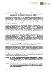 Frage 2: Mit welcher Begründung wurden seit dem Jahr 2019 keine Personen, wel- che im der Schwimmmeisterschule Breitenbrunn tätig sind, in den Prü- fungsausschuss für Fachkräfte für Bäderbetriebe berufen? Sowohl die Prüfungsausschüsse für die Abschlussprüfung Fachangestellte/r für Bäderbetriebe als auch die Prüfungsausschüsse für die Fortbildungsprüfung zum/zur Geprüften Meister/in für Bäderbetriebe wurden im September 2020 planmäßig für die nächsten fünf Jahre neu berufen. Die Mitglieder müssen gemäß § 40 Abs. 1 S. 2 Berufsbildungsgesetz für die Prüfungsgebiete sachkundig und für die Mitwirkung im Prüfungswesen geeignet sein. In den Prüfungsausschuss für gemeinsame Aufgaben „Fachangestellte/r für Bäderbetriebe“ wurden fünf Mitglieder, die teilweise auch als Dozenten in den durch die Landesschwimmmeisterschule Freistaat Sachsen e. V. angebotenen Vorbereitungslehrgängen tätig sind, durch die Landesdirektion Sachsen berufen. In die Prüfungsausschüsse für die Abnahme der praktischen Prüfung wurden zusätzlich noch zwei weitere Mitglieder, die an der Landesschwimmmeisterschule Freistaat Sachsen e.V. als Dozent tätig und von dort vorgeschlagen worden sind, berufen. In den Prüfungsausschuss für gemeinsame Aufgaben „Geprüfte Meister/innen für Bäderbetriebe“ wurden sechs Mitglieder, die ebenfalls als Dozenten in den durch die Landesschwimmmeisterschule Freistaat Sachsen e. V. angebotenen Vorbereitungslehrgängen tätig sind, durch die Landesdirektion Sachsen berufen. In die Prüfungsausschüsse für die Abnahme der praktischen Prüfung wurden insgesamt neun Mitglieder, die an der Landesschwimmmeisterschule Freistaat Sachsen e. V. tätig und von dort vorgeschlagen worden sind, berufen. Frage 3: Wo werden die Prüfung für Fachkräfte für Bäderbetriebe durchgeführt und nach welchen Kriterien wird der Standort ausgewählt? Die schriftlichen Prüfungen für die Fachangestellten und Meister werden entweder in den Räumlichkeiten der Landesdirektion Sachsen oder in der Berufsschule in Chemnitz absolviert, die praktischen Prüfungen finden im Stadtbad Chemnitz statt. Die praktische Prüfung der Meister fand 2020 in der Schwimmhalle der Universität Leipzig statt. Bei der Auswahl der Prüfungsorte wird darauf geachtet, dass einerseits für die Prüfungsteilnehmer geeignete und gleiche Prüfungsbedingungen herrschen und anderseits bei den Anmietungskosten für den Freistaat Sachsen die Grundsätze der Wirtschaftlichkeit und Sparsamkeit beachtet werden. Frage 4: In welcher Gesamthöhe hat die Schwimmmeisterschule in Breiten- brunn staatliche Gelder zum Fortbestand während der Corona Pande- mie beantragt und in welcher Höhe wurden aus welchem Förderpro- gramm Mittel bewilligt? Frage 5: Welche Mittel für investive Maßnahmen hat die Schwimmmeisterschule in Breitenbrunn in den letzten 10 Jahren beantragt, für welche Maßnah- men wurden Mittel bewilligt und aus welchen Gründen wurden gegebe- nenfalls Mittel abgelehnt? Seite 2 von 3