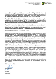 STAATSMlNlSTERlUM FÜR SOZlALES UND GESELLSCHAFTUCHEN ZUSAMMENHALT 5iSACHsEN auch die Entwicklung der sog. Notfallreserve (innerhalb von 7 Tagen aktivierbare Reserve) nachvollziehen. Die Entwicklungen sind unter der Überschrift „Gesamtzahl gemeldeter ln- tensivbetten (Betreibbare Betten und Notfallreserve" unter https://www.intensivregis- ter.de/#/aktuelle-lage/zeitreihen (zuletzt aufgerufen am 23.03.2022) abrufbar. Frage 3: Im Falle einer im Zeitraum stattgefundenen quantitativen Veränderung der Gesamtzahl von Plätzen bzw. Betten auf den ITS-Stationen der klinischen Einrich- tungen in einzelnen Landkreisen im o.g. Zeitraum: Welche Gründe waren für diese Kapazitätenanpassungen maßgeblich bzw. entscheidungsrelevant? Frage 4: In welcher Höhe förderten Bund und Freistaat Sachsen den Aus- bzw. Um- bau von ITS-Plätzen zur spezifischen Aufnahme von Covid-19-Patienten in den Landkreisen des Freistaats Sachsen seit Beginn der Coronapandemie? Bitte mit de- taillierter Aufschlüsselung nach Jahr, Landkreis, Einrichtung und Förderhöhe. Zusammenfassende Antwort auf die Fragen 3 und 4: Da die intensivmedizinischen Behandlungskapazitäten im Freistaat Sachsen nicht geson- dert geplant werden (vgl. Krankenhausplan des Freistaates Sachsen, 12. Fortschreibung, abrufbar unter: https://www.gesunde.sachsen.de/56.html - zuletzt aufgerufen am 23.03.2022) können lediglich Angaben zum Aufwuchs von intensivmedizinischen Behand- lungskapazitäten im Rahmen der SARS-CoV-2-Pandemie getroffen werden. In diesem Zu- sammenhang wurde jeder zusätzlich geschaffene intensivmedizinische Behandlungsplatz mit maschineller Beatmungsmöglichkeit, der bis zum 30.09.2020 aufgestellt oder vorge- halten wurde, gemäß § 21 Absatz 5 Krankenhausfinanzierungsgesetz (KHG) mit Bundes- mitteln gefördert. Diese Kapazitäten wurden geschaffen, um eine Überlastung der inten- sivmedizinischen Behandlungsmöglichkeiten - sowohl für COVID-19- als auch für nicht- COVID-19-Patientinnen und Patienten - im Freistaat Sachsen möglichst zu verhindern. Im Zusammenhang mit der Förderdung nach § 21 Absatz 5 KHG wurden insgesamt 947 zusätzliche intensivmedizinische Behandlungskapazitäten aufgebaut. Jeder Behandlungs- platz wurde mit einer Pauschale von 50.000,00 EUR gefördert. Das entspricht einer Summe von 47.350.000,00 EURO. Jeder dieser zusätzlich geschaffenen intensivmedizi- nischen Behandlungsplätze wurde selbstverständlich nicht als spezifische Behandlungs- kapazität für COVID-19-Patientinnen und Patienten geschaffen, sondern in jedem einzel- nen Fall sowohl für COVID-19- als auch für nicht-COVID-19-Patientinnen und Patienten. Eine Aufschlüsselung der geförderten Behandlungskapazitäten kann der Anlage entnom- men werden. Zudem hat der Freistaat Sachsen Fälle, in denen die Pauschale von 50.000,00 EUR zur Herrichtung der Behandlungsplätze nicht ausreichend war, mit insgesamt 1. 783.692,48 EUR gefördert. Mit freundlichen Grüßen Anlage Seite 2 von 2