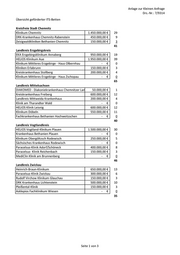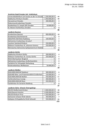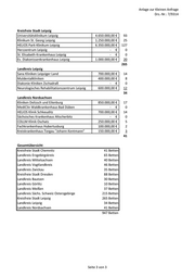 Anlage zur Kleinen Anfrage Drs.-Nr.: 7/9314 Kreisfreie Stadt Leipzig Universitätsklinikum Leipzig 4.650.000,00 € 93 Klinikum St. Georg Leipzig 1.250.000,00 € 25 HELIOS Park-Klinikum Leipzig 6.350.000,00 € 127 Herzzentrum Leipzig - € 0 St. Elisabeth-Krankenhaus Leipzig - € 0 Ev. Diakonissenkrankenhaus Leipzig 1.000.000,00 € 20 265 Landkreis Leipzig Sana Kliniken Leipziger Land 700.000,00 € 14 Muldentalkliniken 400.000,00 € 8 Diakonie Kliniken Zschadraß - € 0 Neurologisches Rehabilitationszentrum Leipzig 600.000,00 € 12 34 Landkreis Nordsachsen Kliniken Delizsch und Eilenburg 850.000,00 € 17 MediClin Waldkrankenhaus Bad Düben - € 0 HELIOS Klinik Schkeuditz 700.000,00 € 14 Sächsisches Krankenhaus Altscherbitz - € 0 COLLM Klinik Oschatz 250.000,00 € 5 Fachkrankenhaus Hubertusburg 100.000,00 € 2 Kreiskrankenhaus Torgau "Johann Kentmann" 150.000,00 € 3 41 Gesamtübersicht Kreisfreie Stadt Chemnitz 41 Betten Landkreis Erzgebirgskreis 65 Betten Landkreis Mittelsachsen 40 Betten Landkreis Vogtlandkreis 46 Betten Landkreis Zwickau 35 Betten Kreisfreie Stadt Dresden 88 Betten Landkreis Bautzen 30 Betten Landkreis Görlitz 10 Betten Landkreis Meißen 37 Betten Landkreis Sächs. Schweiz Osterzgebirge 215 Betten Kreisfreie Stadt Leipzig 265 Betten Landkreis Leipzig 34 Betten Landkreis Nordsachsen 41 Betten 947 Betten Seite 3 von 3