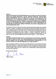 STAATSMINISTERIUM Freistaat DES INNERN SACHSEN Frage 3: Welche Erkenntnisse hat die Staatsregierung zu der Frage, wie viele der Personen, welche die „Erfurter Resolution“ und die „Dresdner Erklärung“ unterschrieben hatten, AfD-Mitglieder waren und aktuell noch sind und woher stammen diese Erkenntnisse und auf welcher rechtlichen Grundlage wird insbesondere die Unterzeichnung der „Erfurter Resolution“ von 2015 noch immer als ein Indikator für das Personenpotential des „Flügels“ herangezogen? (Bitte konkret ausführen, wie dies mit der Rechtsprechung zu vereinbaren ist, wonach regelmäßig für VS Zuordnungen als Zeithorizont lediglich Aktivitäten der jeweils vorangegangen zwei Jahre heranzuziehen sind) Der Beantwortung der Fragestellung stehen teilweise gesetzliche Regelungen entgegen (Artikel 51 Absatz 2 Verfassung des Freistaates Sachsen [SächsVerfl). Gemäß § 15 Satz 1 Gesetz über den Verfassungsschutz im Freistaat Sachsen (SächsVSG) unterrich- ten das Staatsministerium des Innern und das LfV Sachsen die Öffentlichkeit über Be- strebungen und Tätigkeiten nach 88 2 Absatz 1, 3 Absatz 1 SächsVSG. Insoweit be- schränkt sich die Berichterstattung auf erwiesene extremistische Bestrebungen. Im Üb- rigen wird auf die zusammenfassende Antwort auf die Fragen 1, 2 und 5 verwiesen. Frage 4: Von welchem Zeitpunkt datieren die o.g. Erklärungen des LfV-Sachsen gegenüber den DNN in denen es heißt: „Der Verfassungsschutz sieht die Gruppe, die sich offiziell aufgelöst hat, als erwiesen rechtsextremistische Bestrebung an. [...] In Sachsen werden rund 1400 AfD Mitglieder zum ‚Flügel‘ gezählt.“? Das LfV Sachsen erklärte für den oben genannten Beitrag in den Dresdner Neuesten Nachrichten (DNN) am 7. März 2022, dass der „Flügel“ ein rechtsextremistischer Perso- nenzusammenschluss innerhalb der Partei AfD ist. Die Aussagen zum Personenpoten- tial des „Flügels“ waren dem am 5. Oktober 2021 veröffentlichten Verfassungsschutzbe- richt 2020 zu entnehmen. Mit freundlichen Grüßen _\AL Nom to rmin Schuster Seite 3 von 3