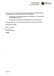 STAATSMINISTERIUM Freistaat FÜR WISSENSCHAFT SACHSEN KULTUR UND TOURISMUS In Höhe von 2.441,0 TEUR wurde die Übertragung der Mittel ins Jahr 2022 beantragt. Die Studentenwerke haben dafür folgende Gründe vorgetragen: - Verzögerungen im Bau: Lieferengpässe bei Baumaterialien, Personalmangel in den beauftragten Baufirmen - Verzögerungen durch generelle Lieferengpässe und Lieferschwierigkeiten Für die verbleibenden rund 100 TEUR wurde keine weitere Übertragung beantragt. Mit freundlichen Grüßen Sebastian Gemkow Anlage Seite 3 von 3