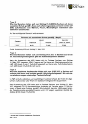 STAATSMINISTERIUM Freistaat DES INNERN SACHSEN Frage 2: Wie viele Menschen hielten sich zum Stichtag 31.03.2022 in Sachsen auf, denen subsidiärer Schutz gemäß $ 4 des Asylverfahrensgesetzes zuerkannt worden ist? (Bitte aufschlüsseln nach Männern, Frauen, Minderjährigen männlichen oder weiblichen Geschlechts!) Auf die nachfolgende Übersicht wird verwiesen: Personen mit subsidiärem Schutz gemäß $ 4 AsyIG' davon darunter Gesamt . Bun männlich weiblich unter 18 Jahre? 7.3324 4.481 2.848 2.088 Quelle: Auswertung AZR zum Stichtag 31. Marz 2022 Frage 3: Wie viele Menschen hielten sich zum Stichtag 31.03.2022 in Sachsen auf, für die ein Abschiebungsverbot gemäß $ 60 des Aufenthaltsgesetzes besteht? Nach der Auswertung des AZR hielten sich im Freistaat Sachsen zum Stichtag 31. März 2022 insgesamt 5.241 Personen auf, bei denen ein Abschiebungsverbot ge- mäß & 60 Absatz 5 oder 7 AufenthG festgestellt und denen eine Aufenthaltserlaubnis nach 8 25 Absatz 3 AufenthG erteilt wurde. Frage 4: Wie viele abgelehnte Asylbewerber hielten sich zum 31.03.2022 in Sachsen auf und wie viele davon sind geduldet gemäß $ 60a Aufenthaltsgesetz? Wie viele da- von wiederum wegen notwendiger Passbeschaffung? Im AZR sind alle vollziehbar ausreisepflichtigen Ausländer erfasst. Der Anteil der abge- lehnten Asylbewerber unter ihnen wird statistisch nicht gesondert ausgewiesen. Nach Auswertung des AZR hielten sich im Freistaat Sachsen zum Stichtag 31. März 2022 insgesamt 15.172 ausreisepflichtige Ausländer auf. Darunter waren 11.764 Per- sonen im Besitz einer Duldung gemäß $ 60a AufenthG, darunter 3.868 wegen fehlen- der Reisedokumente geduldete Personen und 2.107 wegen ungeklärter Identität Ge- duldete (8 60b Absatz 1 AufenthG). 4 darunter drei Personen unbekannten Geschlechts Seite 2 von 3