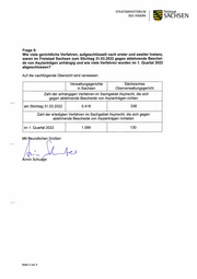 STAATSMINISTERIUM Freistaat DES INNERN SACHSEN Frage 5: Wie viele gerichtliche Verfahren, aufgeschlüsselt nach erster und zweiter Instanz, waren im Freistaat Sachsen zum Stichtag 31.03.2022 gegen ablehnende Beschei- de von Asylanträgen anhängig und wie viele Verfahren wurden im 1. Quartal 2022 abgeschlossen? Auf die nachfolgende Übersicht wird verwiesen: Verwaltungsgerichte Sächsisches in Sachsen Oberverwaltungsgericht Zahl der anhängigen Verfahren im Sachgebiet Asylrecht, die sich gegen ablehnende Bescheide von Asylanträgen richten am Stichtag 31.03.2022 5.418 338 Zahl der erledigten Verfahren im Sachgebiet Asylrecht, die sich gegen ablehnende Bescheide von Asylanträgen richteten im 1. Quartal 2022 1.099 130 Mit ffeundlichen Grüßen a I m rmin Schuster Seite 3 von 3