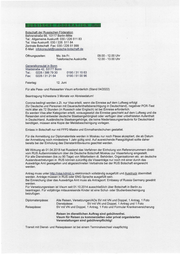 Bei Verbleib auf dem Flughafen Scheremetjewo kann sich ein Ausländer grundsätzlich 24 Stunden ohne Transitvisum dort im Transit aufhalten. Der Passagier muss über eine entsprechende Transiterklärung der Fluggesellschaft für den Anschlussflug verfügen. (http://www.svo.aero/en/transit/int-int/). Bearbeitungszeit: Dienstreisen 5 Arbeitstage Versetzungen ca. 20 Arbeitstage und mehr Familienbesuchsreisen 15 Arbeitstage Bezahlung mit EC-Karte oder Überweisung: Commerzbank AG, BLZ 120 800 00, Kto. 409 775 48 00, IBAN: DE42 1208 0000 4097 7548 00 BIC (SWIFT-Code): COBADEFF Keine Gebühren bei Eltern, Schwiegereltern, Kindern und Enkeln, Geschwistern von AA-Angehörigen bei Vorlage gesiegelter Einladung. Alle anderen Gebühren in Höhe von 35,-- bitte nur überweisen. Bei Antragstellung bitte Ausdruck Überweisungsträger beigefügen. Bitte kein Bargeld! Einladung Bei Besuch von Angehörigen der Botschaft Einladungsschreiben (Vordruck) beifügen Bei sonstigen Reisen immer Einladung vorlegen. Für Moskau und St. Petersburg muss die Einladung auf dem Formular des Russischen Innenministeriums ausgestellt oder per Telexnummer mitgeteilt werden. Lehrer, Lektoren, Fachberater Für Lehrkräfte der ZfA greift das Kulturabkommen zwischen Deutschland und Russland, es gibt einen Sonderparagraphen für hochqualifizierte Arbeitskräfte. Die Schule stellt in der Regel eine Einladung entsprechend der Gesetzgebung aus, mit derselbigen und dem Pass wird dann ein 06- Visum über ZfA, AA und Russisches AE für Lehrkräfte erteilt. Pässe müssen mindestens 18 Monate gültig sein, da Arbeitsvisa nur mit 1 Jahr Gültigkeit ausgestellt werden können. Sonstiges Dienstreisen mit Reisepässen und Visa für Praktikanten/Referendare sind gebührenfrei! Journalisten: Es werden keine Mehrfachvisa mehr für Journalisten erteilt. Vorzulegen sind zusätzlich zu den sonstigen Unterlagen eine Kopie des Presseausweises sowie Bestätigung des Arbeitgebers, dass sich der Journalist für journalistische Tätigkeit nach Russland begeben wird. Bei Versetzungen Vorgänger mit Vornamen und Anmeldebezeichnung sowie zukünftige Anmeldebezeichnung angeben Ausländische Staatsangehörige müssen deutsche Aufenthaltsgenehmigung vorlegen Staatsangehörigkeit in VN angeben. Passgültigkeit: Mindestens 6 Monate über Aufenthalt hinaus Visagültigkeit: Dienstreise wie beantragt, Versetzung 3 Monate ab beantragtem Datum, eine Einreise Lebensgefährten: SV mit VN-Doppel, Reisepass Anträge - 2-fach — und Bescheinigung von 101/103 SV wird gebührenfrei erteilt (ohne KV-Nachweis)