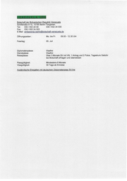 Botschaft der Bolivarischen Republik Venezuela . Schillstraße 9-10, 10785 Berlin-Tiergarten Tel: 030/832 24 00 030 / 832 24 030 Fax: 030/832 24 020 E-Mail: embavenez.berlin@botschaft-venezuela.de Öffnungszeiten: Mo. bis Fr. 09.00 - 12.30 Uhr Feiertag: 05. Juli Diplomatenpässe: Visafrei Dienstpässe: Visafrei Reisepässe: Über 3 Monate SV mit VN, 1 Antrag und 2 Fotos, Tageskurs Gebühr bei Botschaft erfragen und überweisen Passgültigkeit: Mindestens 6 Monate Visagültigkeit: 30 Tage ab Einreise Ausländische Ehegatten mit deutschem Diplomatenpass SV-frei