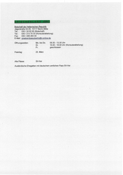 Botschaft der Hellenischen Republik Jägerstraße 54-55, 10117 Berlin-Mitte Tel: 030/20 62 60 (Botschaft) Tel: 030/213 70 33 (Konsularabteilung) Fax: 030 / 206 264 44 E-Mail: greekembassyberlin@t-online.de Öffnungszeiten: Mo. bis Do. 09.30 - 13.30 Uhr Di. 15.00 - 18.00 Uhr (Konsularabteilung) Er. geschlossen Feiertag: 25. März Alle Pässe: SV-frei Ausländische Ehegatten mit deutschem amtlichen Pass SV-frei