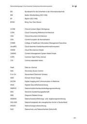 Rahmenbedingungen Cloud-basierter Krankenhausinformationssysteme BSI Bundesamt für die Sicherheit in der Informationstechnik BW Baden-Württemberg (ISO 3166) BY Bayern (ISO 3166) BYOD Bring Your Own Device CCOW Clinical Context Object Workgroup CCRA Cloud Computing Reference Architecture CDA Clinical Document Architecture CEN Comité Européen de Normalisation CHIME College of Healthcare Information Management Executives cloudKIS Cloud-basiertes Krankenhausinformationssystem CMSM Cloud MicroService Modul CMSMS Content-Management-System Made Simple COPS Common Open Policy Service CSV Comma-separated values DaaS Data as a Service DAC Discrenary Access Control D-A-CH Deutschland Österreich Schweiz DDD Domain Driven Design DICOM Digital Imaging and Communication in Medicine DIGA Digitale Gesundheitsanwendung DKBFVO Datenschutzkirchenbezirksfestlegungsverordnung DKG Deutsche Krankenhausgesellschaft DRG Diagnosis Related Group DSDEVO Datenschutzdurchführungs- und -ergänzungsverordnung DSG-EKD Datenschutzgesetz der evangelischen Kirche in Deutschland DSGVO Datenschutzgrundverordnung DuD Datenschutz und Datensicherheit (Zeitschrift) - 293 -