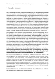 Rahmenbedingungen Cloud-basierter Krankenhausinformationssysteme 1 Executive Summary Die IT-Welt wandelt sich, viele Unternehmen sind einerseits mit dem eigenständigen Betrieb der immer komplexer werdenden Infrastrukturen und Middleware-Software überfordert, an- dererseits wachsen eCommerce, elektronische Verkaufsplattformen und Enterprise Informati- onssysteme immer mehr zusammen. Die Zeit der Cloud-Systeme und -Anwendungen ist an- gebrochen. Die Legacy-Dinosaurier – also die großen softwaremonolithischen Altsysteme – sterben aus und machen Herden von agilen, intelligent kollaborierenden Software-Kleintieren – den Microservices – Platz. Systemgrenzen verschwimmen, IT-Ressourcen und Software wer- den nicht mehr gekauft, sondern bedarfsgerecht bezogen und wieder abgestoßen. Kapitalbin- dung war gestern. Das Vor-Ort-Personal kann sich auf die strategischen und anwendungsbe- zogenen Aspekte konzentrieren, die Betreuung und technologische Weiterentwicklung der Inf- rastruktur und Software übernimmt der Servicepartner. Mit kalkulierbaren laufenden Kosten orientiert an der Ressourcennutzung oder der betrieblichen Wertschöpfung (z.B. Anzahl abge- wickelter Vorgänge, Fälle) erhält man die neuesten Innovationen zeitnah ins Unternehmen. Die Vorteile des Cloud-Computings für ein Unternehmen, aber auch die Möglichkeit des Auf- baus Cloud-basierter regionaler, nationaler oder weltumspannender digitaler Ökosysteme, sind auch im Krankenhauswesen von großem Interesse, wenngleich hier eher in einem regio- nalen Kontext. Dies sowohl für die einzelnen Krankenhäuser, deren IT-Personal durch die sich schnell wandelnden Technologien und die große Themenvielfalt zunehmend überfordert wird, als auch für die Hersteller von Krankenhausinformationssystemen (KIS), bei denen die Größe und Komplexität der Legacy-Software zu abnehmender Handhabbarkeit, zunehmendem Inno- vationstau und damit sinkender Wettbewerbsfähigkeit führt, und für die Dienstleistungsre- chenzentren, die heute Legacy-KIS im Auftrag von Krankenhäusern betreiben. Cloud-Compu- ting für Krankenhäuser bildet sich in Form der Nutzung von Cloud-KIS ab. Ein Cloud-KIS ist die Summe aller über eine Cloud beziehbaren Plattform- und Software- Ressourcen zur Verarbeitung aller notwendigen Daten zur Unterstützung aller administ- rativen, logistischen und medizinischen Vorgänge bis hin zum Controlling, dem Quali- tätsmanagement sowie dem strategischen Management von Krankenhäusern. Der Einsatz von Cloud-KIS hat für Krankenhäuser vielfältige Vorteile; hierzu zählen u.a. die Hochverfügbarkeit, das hohe Sicherheitsniveau, die passgenau Orchestrierung der Anwen- dungsumgebung, ressourcennutzungs- oder wertschöpfungsorientierte Kostenmodelle, die sukzessive Hinzunahme von Funktionalitäten, die Möglichkeit aus verschiedenen alternativen Modulen zu wählen, die Schaffung von Freiräumen für das Vor-Ort-IT-Personal für die Kon- zentration auf fachliche und strategische Belange der IT im Krankenhaus, der Abbau von Her- stellerabhängigkeit, Wegfall der Notwendigkeit zur Installationen und zum Management von Clients sowie die einfache Integration von „Fremdsoftware“ in Form von “KIS-Plugins” und Ei- genentwicklungen. Für Cloud-KIS können vor dem Hintergrund bestehender Cloud-Plattformen und -Technolo- gien zwei wesentliche Fragekomplexe adressiert werden: -8-
