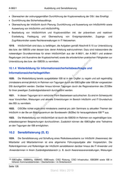 A-960/1 Anlagen 9. Der Bausteinkatalog ist in sogenannte Schichten eingeteilt. Diese sind: • B 1: Übergreifende Aspekte • B 2: Infrastruktur • B 3: IT-Systeme 144 • B 4: Netze • B 5: Anwendungen 10. Der Gefährdungskatalog ist in die folgenden Kategorien gegliedert, wobei die Referenzierung analog zu der des Bausteinkatalogs erfolgt: • G 1: Höhere Gewalt • G 2: Organisatorische Mängel • G 3: Menschliche Fehlhandlungen st en • G 4: Technisches Versagen sd i • G 5: Vorsätzliche Handlungen ng ru 11. de Der Maßnahmenkatalog ist in die folgenden Kategorien gegliedert, wobei die Referenzierung Än analog zu der des Bausteinkatalogs erfolgt: m de • M 1: Infrastruktur ht • M 2: Organisation ic tn • M 3: Personal eg rli • M 4: Hard- und Software te un • M 5: Kommunikation k uc • M 6: Notfallvorsorge dr us rA Für die Bw sind die InfoSichh-Maßnahmen der Kategorien 4 und 5 den technischen InfoSichh- Maßnahmen zuzuordnen. se ie D 12. Ein Baustein trägt Referenzen nach dem folgenden Muster „B X.YY(Y)“, wobei das B für „Baustein“, das X für die zugeteilte Bausteinschicht und YY(Y) eine eindeutige zwei- oder dreistellige Nummer in der Schicht ist. Ergänzende Bausteine der Bw erhalten eine dreistellige Endnummer (Schema: B X.YYY) 13. Analog dazu sind die Gefährdungen und Maßnahmen durchnummeriert mit dem Unterschied, dass alle bundeswehrspezifischen Gefährdungen und Maßnahmen eine vierstellige Endnummer erhalten (Schema: G oder M X.YYYY). 144 Der Begriff "IT-System" wird hier im Sinne des IT-Grundschutzes des BSI als Bezeichnung der Schicht 3 der Bausteine verwendet. Anders als sonst in dieser Vorschrift bezeichnet der Begriff des BSI hier keine vollständigen Systeme, sondern einzelne IT-Komponenten, wie beispielsweise Clients, Server oder Router. Seite 132 Stand: März 2019