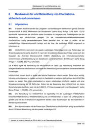 A-960/1 Meldewesen für und Behandlung von Informationssicherheitsvorkommnissen • schlägt bei Bedarf zur weiteren Aufklärung eines InfoSichhVork dem bzw. der Verantwortlichen für die InfoSichh im jeweiligen Anwendungsbereich (siehe Nr. 402) die Durchführung einer InfoSichhPrfg (siehe Abschnitt 7.4) vor. • beteiligt den zuständigen bzw. die zuständige ADSB, wenn PersDat betroffen sind. • beteiligt den bzw. die SichhBeauftr, wenn der Schutz von VS betroffen ist bzw. ein Hinweis auf extremistische / terroristische Bestrebungen oder sicherheitsgefährdende oder geheimdienstliche Tätigkeiten vorliegt (siehe dazu Abschnitt 8.6). Wird der bzw. die SichhBeauftr eingeschaltet und ergibt dessen / deren Prüfung, dass das Ereignis als Sicherheitsvorkommnis gemäß Zentraler Dienstvorschrift A-1130/1 VS-NfD „Militärische Sicherheit in der Bundeswehr – Militärische 118 Sicherheit“ (siehe Bezug Anlage 11.15 (lfdNr. 14)) zu qualifizieren ist, übernimmt der bzw. die SichhBeauftr die Federführung für das Vorkommnis und die weitere Bearbeitung. st • beteiligt den bzw. die SichhBeauftr der DSt, wenn sich aus dem InfoSichhVork Hinweise auf ein en Sicherheitsrisiko 119 (siehe Bezug Anlage 11.15 (lfdNr. 16)) ergeben. sd i ng • veranlasst bei Verdacht einer Straftat oder eines Dienstvergehens unverzüglich eine Meldung an ru de den zuständigen Disziplinarvorgesetzten bzw. die zuständige Disziplinarvorgesetzte 120 (für Soldaten Än bzw. Soldatinnen), an den zuständigen Dienstvorgesetzten bzw. die zuständige Dienstvorgesetzte m de (für Beamte bzw. Beamtinnen) oder an die zuständige Personalführung (für Tarifbschäftigte). Das ht Ergebnis der Prüfungen und ggf. die Meldung an den bzw. die Disziplinarvorgesetzte(n) ist zu ic tn dokumentieren und bei der DSt / im EinsKtgt zur InfoSichhDok (siehe Abschnitt 6.1.1) zu nehmen. eg rli • führt eine Übersicht über alle gemeldeten InfoSichhVork in der InfoSichhDok der DSt bzw. des te EinsKtgt (siehe Abschnitt 6.1.1). un k uc 813. Der bzw. die Verantwortliche dr für die InfoSichh im Anwendungsbereich (i.d.R. DStLtr / KtgtFhr / ProjLtr) us rA se • übernimmt die Aufgaben des bzw. der ISB, wenn er bzw. sie keinen bzw. keine ISB bestellt hat. ie D • ist verantwortlich für die unverzügliche und umfassende Meldung und weitere Behandlung der InfoSichhVork in seinem bzw. ihrem Zuständigkeitsbereich. 118 Die Meldung eines erkannten Sicherheitsvorkommnisses erfolgt nach den Vorgaben des Zentralerlasses B- 1130/32 VS-NfD „Melde-, Berichts- und Informationswege zur Erstellung der Militärischen Sicherheitslage der Bundeswehr“ (vgl. Nr. 820). 119 ZDv A-1130/3 „Militärische Sicherheit in der Bundeswehr – Personeller Geheim- und Sabotageschutz“, Nr. 2408: Ein Sicherheitsrisiko liegt vor, wenn tatsächliche Anhaltspunkte (1) Zweifel an der Zuverlässigkeit des Betroffenen bei der Wahrnehmung einer sicherheitsempfindlichen Tätigkeit begründen) oder (2) eine besondere Gefährdung durch Anbahnungs- und Werbungsversuche fremder Nachrichtendienste, insbesondere die Besorgnis der Erpressbarkeit, begründen) oder (3) Zweifel am Bekenntnis des Betroffenen zur freiheitlichen demokratischen Grundordnung im Sinne des Grundgesetzes oder am jederzeitigen Eintreten für deren Erhaltung begründen). 120 Die endgültige Bewertung, ob ein Verdacht nach § 32 Absatz 1 der Wehrdisziplinarordnung vorliegt, sowie die ggf. anschließende Aufnahme disziplinarer Ermittlungen obliegt dem bzw. der zuständigen Disziplinarvorgesetzten. Seite 106 Stand: März 2019