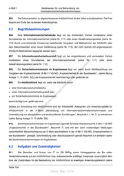 A-960/1 Meldewesen für und Behandlung von Informationssicherheitsvorkommnissen 805. Die Dokumentation zu abgeschlossenen InfoSichhVork ist drei Jahre aufzubewahren. Die Frist beginnt am Ende des laufenden Kalenderjahres. 8.2 Begriffsbestimmungen 806. Eine Informationssicherheitslücke liegt vor bei drohendem Verlust mindestens eines Grundwertes der Informationssicherheit (siehe Nr. 111) oder eines Gewährleistungszieles (siehe Nr. 112) durch unzureichende Umsetzung bestehender Vorgaben und Maßnahmen der InfoSichh oder dem Bekanntwerden einer neuen Gefährdung (siehe Nr. 115), der nicht zeitnah mit angemessenen InfoSichh-Maßnahmen begegnet werden kann. 807. Ein Informationssicherheitsverstoß liegt vor bei eingetretenem und vermutetem Verlust mindestens eines Grundwertes der Informationssicherheit (siehe Nr. st 111) oder eines Gewährleistungszieles (siehe Nr. 112). en sd i 808. ng Ein Sicherheitsvorkommnis im Kryptowesen liegt vor, wenn durch Nichtbeachtung von ru Vorgaben der Kryptosicherheit (A-961/1 VS-NfD „Kryptosicherheit in der Bundeswehr“, (siehe Bezug de Än Anlage 11.15 (lfdNr. 20))) die Kryptosicherheit beeinträchtigt oder gefährdet ist. m 809. de Ein InfoSichhVork liegt vor, wenn die InfoSichh durch ht • eine Informationssicherheitslücke, ic tn • einen Informationssicherheitsverstoß oder eg rli • ein Sicherheitsvorkommnis im Kryptowesen te un beeinträchtigt bzw. gefährdet wird. k uc dr Details zur Einordnung von InfoSichhVork sind der Arbeitshilfe „Kategorien und Anwendungsfälle für us rA InfoSichhVork“ in der A-960/5 „Behandlung von Informationssicherheitsvorkommnissen und se Unterstützung von disziplinaren und strafrechtlichen Ermittlungen“, Abschnitt 4.1, Nr. 3. zu entnehmen ie D (siehe Bezug Anlage 11.15 (lfdNr. 59)). 810. Sicherheitsvorkommnisse im Kryptowesen (gemäß Zentraler Dienstvorschrift A-961/1 VS-NfD „Kryptosicherheit in der Bundeswehr“, Abschnitt 7) sind mit den dann notwendigen Meldungen (einschließlich Benachrichtigung per E-Mail) abschließend in der A-961/1 VS-NfD „Kryptosicherheit in der Bundeswehr“ geregelt. Sofortmeldung oder Abschlussbericht gemäß Abschnitt 8.4 entfallen daher bei Sicherheitsvorkommnissen im Kryptowesen. 8.3 Aufgaben und Zuständigkeiten 811. Alle Betreiber und Nutzer von IT im GB BMVg sowie Vertragspartner der Bw sollen Verdachtsmomente auf ein InfoSichhVork bzw. entsprechende auffällige Ereignisse unverzüglich dem bzw. der Zuständigen für die Bearbeitung von InfoSichhVork im jeweiligen Anwendungsbereich (siehe Seite 104 Stand: März 2019