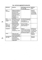 Bau- und Sanierungsbedarfe Bundesarchiv . Liegenschaft Maßnahme Mittelfristige Finanzplanung, geschätzter hier: durch BMF Bedarf haushaltsmäßig anerkannt . . Berlin- Neubau Archivzentrum in - Noch nicht Lichtenberg Lichtenberg auf Gelände bezifferbar, Normannenstraße voraussichtlich (beschlossen vom BT am eine dreistellige 26.09.2019). Alternativ Millionensumme Neubau oder Sanierung bestehender Bürogebäude (Berlin Lichterfelde) Berlin, Neuanmietung von 2023- 2023-2052 (Mietvertrag läuft Frankfurter Allee 2037 wegen Umzug der über 30 Jahre): 5.000 T€/Jahr 204-206 Verwaltung des ehern. veranschlagt im 2. BStU von der Karl- Nachtragshaushalt 2020 Liebknecht-Straße Berlin- Neuanmietung 2023- 2023: 1.917 T€/Jahr Reinickendorf, 2038 wegen Umzug in 2024-2037: 4.600 T€/Jahr Abteilung PA eine moderne und 2038: 2.684 T€/Jahr (ehern. WASt) archivgerechte Liegenschaft Hoppegarten 2. Bauabschnitt des 48.941 T€ Ab Übernahme Filmarchivs Verpflichtungsermächtigung des Filmarchivs (Fertigstellung ca. 2029) muss im HH 2022 beantragt ca. 2029 rd. 3.047 werden ➔ erst dann können T€ BlmA-Miete Baumaßnahmen beginnen pro Jahr Cottbus Aufbau einer neuen - Noch nicht Außenstelle (beschlossen bezifferbar vom BT am 30.10.2020) Außenstellen des Ausbau Außenstellen, die - Noch nicht ehern. BStU Archivstandorte bezifferbar bleien/werden, bzw. Sanierung bestehender Liegenschaften