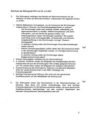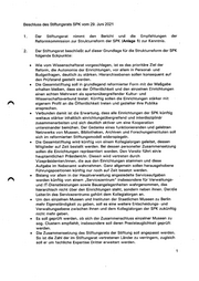 Beschluss des Stiftungsrats SPK vom 29. Juni 2021 1. Der Stiftungsrat nimmt den Bericht und die Empfehlungen der Reformkommission zur Strukturreform der SPK (Anlage 1) zur Kenntnis. 2. Der Stiftungsrat beschließt auf dieser Grundlage für die Strukturreform der SPK folgende Eckpunkte: • Wie vom Wissenschaftsrat vorgeschlagen, ist es das prioritäre Ziel der Reform, die Autonomie der Einrichtungen, vor allem in Personal- und Budgetfragen, deutlich zu stärken. Hierarchieebenen sollen konsequent auf den Prüfstand gestellt werden. • Die Gesamtstiftung soll in grundlegend reformierter Form mit der Maßgabe erhalten bleiben, dass sie der Öffentlichkeit und den einzelnen Einrichtungen einen echten Mehrwert als spartenübergreifender Kultur- und Wissenschaftsverbund bietet. Künftig sollen die Einrichtungen stärker mit eigenem Profil an die Öffentlichkeit treten und gezielter ihre Publika ansprechen. • Verbunden damit ist die Erwartung, dass alle Einrichtungen der SPK künftig weitaus stärker inhaltlich einrichtungsübergreifend und interdisziplinär zusammenarbeiten und sich deutlich aktiver um eine Kooperation untereinander bemühen. Der Gedanke eines funktionierenden und gelebten Netzwerks von Museen, Bibliotheken, Archiven und Forschungsinstituten soll sich im reformierten Stiftungsmodell widerspiegeln. • Die Gesamtstiftung wird künftig von einem Kollegialorgan geleitet, dessen Mitglieder auf Zeit bestellt werden. Bei dessen personeller Zusammensetzung sollen die Einrichtungen repräsentiert werden. Den Vorsitz führt ein/e hauptamtliche/r Präsident/in. Diese/r wird vertreten durch Vizepräsidenten/innen, die aus den Einrichtungen stammen und diese Aufgabe im Nebenamt wahrnehmen. Ganz allgemein sollen herausgehobene Führungspositionen künftig nur noch auf Zeit besetzt werden. • Bislang vor allem in der Hauptverwaltung angesiedelte Serviceaufgaben werden künftig von einem „Servicezentrum" insbesondere für Verwaltungs- und IT-Dienstleistungen sowie Bauangelegenheiten wahrgenommen, das hierarchisch nicht über den Einrichtungen steht, sondern neben ihnen. Der/die Leiter/in des Servicezentrums gehört dem Kollegialorgan an. • Um den einzelnen Museen und Instituten der Staatlichen Museen zu Berlin mehr Eigenständigkeit zu geben, soll es eine weitere Entscheidungs- und Verwaltungsebene zwischen ihnen und dem Kollegialorgan der SPK zukünftig nicht mehr geben. • Es soll geprüft werden, ob sich der Zusammenschluss einzelner Museen zu sog. Clustern empfiehlt, insbesondere soll deren Praxistauglichkeit geprüft werden. • Die Zusammensetzung des Stiftungsrats der Stiftung soll angepasst werden. So ist die Zahl der im Stiftungsrat vertretenen Länder zu verringern, zugleich soll er um fachliche Expertise Dritter erweitert werden. 1