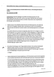 Bündnis 90/Die Grüne: Fragen an das Bundeskanzleramt, 16.102021 Fragen an das Bundeskanzleramt: Bündnis 90/Die Grünen, Verhandlung-AG Kultur & Medien hier: Antworten der BKM Vorbemerkung: Ebenfalls beigefügt ist das BKM-Haushaltskompendium für den Regierungsentwurf des Jahres 2021, welches einen guten Überblick über die einzelnen Haushaltsstellen des Bundeskulturetats vermittelt, insbesondere über die geförderten Einrichtungen und ihre Gremien. o Gebeten wird um eine detaillierte Übersicht über die Förderprogramme, ihre Dotierung (Soll), ihre /ST-Ausgaben, aktueller Status, Haushaltsreste sowie um eine detaillierte Übersicht über die Anteile der einzelnen Länder an den Bundesprogrammen von Neustart Kultur Die erbetene Übersicht zum Stand 10. September 2021 findet sich in Anlagen la und lb. Die Antragszahlen und -volumina sind mit über 75.000 eingegangenen Anträgen konstant sehr hoch. Knapp die Hälfte der eingegangenen Anträge wurde bereits bewilligt. Die Bewilligungsverfahren bei den mittelausreichenden Stellen laufen unter Hochdruck, allerdings hat sich der lange Lockdown bis in die Mitte dieses Jahres vielfach auf die Durchführbarkeit der Programmkonzepte und damit auch auf die Mittelabrufe ausgewirkt. Es wird deshalb davon ausgegangen, dass sich seit der letzten Datenerhebun!l vor knapp zwei Monaten weitere deutliche Steigerungen bei den Antragszahlen und Mittelbewilligungen ergeben haben. o Bei welchen Einrichtungen in der Trägerschaft des Bundes/ die vom Bund institutionell (', gefördert werden, besteht ein konkreter Weiterentwicklungsbeda,f und welche anstehenden finanziellen Mehrbedarfe sind bereits bekannt? Sind diese ggf im Haushalt bzw. der Mittelfristigen Finanzplanung berücksichtigt? s. Anlage 2 o Welche Schritte bei der Strukturempfehlung zur SPK {Gutachten) wurden bereits eingeleitet und mit welchen Gesamtkosten plant die Bundesregierung bei der Umsetzung der Reform? zur Steuerung des Reformprozesses hat der Stiftungsrat der SPK eine Reformkommission auf Ministerebene unter Vorsitz der BKM eingesetzt (weitere Mitglieder: BE, HH, NW, ST sowie Amtschef der BKM, Präsident und Vizepräsident der SPK). Diese hat sich in sieben Sitzungen ausführlich mit den Vorschlägen des Wissenschaftsrats, des Bundesrechnungshofes und der von ihr beauftragten Berater befasst und sich dabei auch intensiv mit Vertreterinnen und Vertretern der Einrichtungen der SPK ausgetauscht. Die Seite 1 von 10