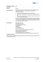 Fördergebiet / Gebietsab- Bund grenzungen Förderart Zuschuss Das Bundesministerium für Umwelt, Naturschutz, Bau und Reaktorsicherheit Ziel und Gegenstand (BMUB) fördert Maßnahmen zur Anpassung an den Klimawandel. Förderschwerpunkte sind: Erstellung von Klimaanpassungskonzepten für Unternehmen, Entwicklung von Bildungsmodulen zu Klimawandel und Klimaanpassung so- wie kommunale Leuchtturmvorhaben und Aufbau von Kooperationen interkom- munaler oder regionaler Verbünde. Ziel ist es, die Anpassungsfähigkeit der gesellschaftlichen Akteure insbesondere auf der lokalen und regionalen Ebene durch Initiativen zur Bewusstseinsbildung, zum Dialog und zur Beteiligung sowie zur Vernetzung und Kooperation von regi- onalen oder lokalen Akteuren zu stärken. Ansprechpartner Projektträger Jülich (PtJ) Geschäftsbereich KLI / FB 4 Forschungszentrum Jülich GmbH Zimmerstraße 26–27 10969 Berlin Tel. 030/20199-577 E-Mail: ptj-ksi@fz juelich.de Service- und Kompetenzzentrum: Kommunaler Klimaschutz Deutsches Institut für Urbanistik (Difu) Beratungshotline: 030/390 01-170 E-Mail: kontakt@klimaschutz-in-kommunen.de Internet: http://www.difu.de und http://www.klimaschutz-in-kommunen.de Zusätzliche Informationen http://www.bmu.de/themen/forschung-foerderung/foerderprogramme/anpassung-an-die-folgen-des-klima- wandels/; Zugriff 18.12.2019. Projekt: PK19-040 Zweckverband Interkommunale Gewerbegebiete Wirtschaftsraum Kaiserslautern - Opportunitätsprüfung Final © FIRU mbH 2020 Seite 31 von 68