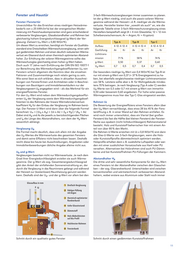 Fenster und Haustür 3-fach-Wärmeschutzverglasungen immer zusammen zu planen. Ist der g-Wert niedrig, sind auch die passiv-solaren Wärme- Fenster / Fenstertür gewinne während der Heizzeit i. d. R. niedriger als die Wärme- Unverzichtbar für das Erreichen eines niedrigen Heizwärme- verluste. Hersteller bieten hier „sowohl als auch“ an, wie die bedarfs von ≤ 25 kWh/(m²a) bei der energetischen Moder folgende Tabelle einer 3-fach-Wärmeschutzverglasung eines nisierung mit Passivhauskomponenten sind ganz entscheidend Herstellers beispielhaft zeigt (4 = 4 mm Glasstärke; 12 = 12 mm verbesserte Verglasungen, Glasabstandhalter und Rahmen bei Scheibenzwischenraum; Ar = Argon; Kr = Krypton): gleichzeitig hohem Energiedurchlassgrad (g-Wert) der Ver- glasung: Zielwert Uw -Wert ≤ 0,80 W/(m²K). Typ A Typ B Typ C Um diesen Wert zu erreichen, benötigt ein Fenster als Qualitäts- Aufbau 4 -12- 4 -12- 4 4 -12- 4 -12- 4 4 -12- 4 -12- 4 standard eine Dreischeiben-Wärmeschutzverglasung, einen sehr Gasfüllung Ar Kr Ar Kr Ar Kr gut gedämmten Rahmen und einen deutlich reduzierten Wärme- Lichttrans- verlust am Glasrand durch einen thermisch optimierten Abstand- halter. Zur Erhöhung der solaren Wärmegewinne sollte das mission 71 % 58 % 74 % Wärmeschutzglas gleichzeitig einen hohen g-Wert haben. g-Wert 0,50 0,37 0,60 Doch auch 17 Jahre nach Einführung der DIN EN ISO 10077-1 Ug -Wert 0,7 0,5 0,7 0,4 0,7 0,5 zur Berechnung des Wärmedurchgangskoeffizienten Uw von Fenstern scheint allgemein die Kenntnis über die einzelnen Der besonders niedrige Ug -Wert von 0,4 W/(m²K) bei Typ B ist Faktoren und Zusammenhänge noch relativ gering zu sein. nur mit einem g-Wert von 0,37 (= 37 % Energiegewinn) zu ha- Wie sonst lässt es sich erklären, dass in aktuellen Ausschrei- ben, bei ebenfalls vergleichsweise niedriger Lichttransmission bungen von Fensterfirmen und Architekten oder in Beschrei- von 58 %. Letztere sollte aber z. B. für Wohngebäude mindes- bungen von Bauträgern und Immobilienverkäufern nur der tens 70 % betragen. Je nach Verglasung (Typ A oder C) werden Verglasungswert Ug angegeben wird – als das Merkmal für ein Ug -Werte von 0,5 oder 0,7 mit einem g-Wert von immerhin energieeffizientes Fenster. 0,50 oder besserem 0,60 angeboten. Für hohe solar-passive Für den Uw -Wert wird neben dem Wärmedurchgangskoeffizi- Wärmegewinne muss hier das Typ C-Glas eingesetzt werden. enten Ug der Verglasung sowie dem Wärmedurchgangskoef- fizienten Uf des Rahmens der lineare Wärmebrückenverlust Rahmen U f koeffizient Ψg für den Einbau der Verglasung im Rahmen benö- Die Bewertung der Energieeffizienz eines Fensters allein über tigt. Der Fenster-U-Wert wird dann über die folgende Formel den Ug -Wert vernachlässigt, dass etwa 28 bis 45 % der Fens- berechnet: Uw = [ (Ug x A g) + (Uf x Af) + (lg x Ψg) ] / (A g + Af) teröffnung z. B. in einer Wand auf den Rahmen entfallen. Es Dabei sind Ag und Af die jeweils zu berücksichtigenden Flächen wird noch immer unterschätzt, dass ein Viertel (bei großen und lg die Länge des Abstandhalters, von dem der Ψg -Wert Fenstern) bis fast die Hälfte (bei kleinen Fenstern) der Fenster- wesentlich abhängt. fläche aus opakem (nicht lichtdurchlässigem) Rahmenmaterial besteht. Holz und Kunststoff beherrschen hier mit einem An- Verglasung Ug teil von über 80 % den Markt. Die Formel macht deutlich, dass sich allein mit der Angabe Die Rahmen-U-Werte erreichen mit Uf ≤ 0,8 W/(m² K) erst dann des Ug -Wertes die Wärmeverluste des gesamten Fensters die Glas-U-Werte von 3-fach-Verglasungen, wenn die Holz- und damit seine Effizienz nicht beschreiben lassen. Deshalb oder Kunststoffprofile dämmtechnisch optimiert werden. reicht diese bis heute bei Ausschreibungen, Angeboten oder Holzprofile erhalten dann z. B. zusätzliche Luftspalten oder wer- Immobilienbewerbungen übliche Angabe alleine nicht aus. den mit einer zusätzlichen Vorsatzschale aus Hanf oder PU versehen. Alternativen bei Holzrahmen sind auch PU-Dämm- Ug und g-Wert kerne und bei Kunststoffrahmen PU-Füllungen der Kammern. Verglasungen bewirken nicht nur Wärmeverluste. Je nach dem Grad ihrer Energiedurchlässigkeit erzielen sie auch Wärme- Abstandhalter Ψg gewinne. Der g-Wert als sog. Gesamtenergiedurchlassgrad Die dritte und sehr wesentliche Komponente für den Uw -Wert gibt den Anteil der einfallenden Sonneneinstrahlung an, der eines Fensters ist der Abstandhalter zwischen den Glasschei- durch die Verglasung in das Rauminnere gelangt und während ben – der sog. Glasrandverbund. Unterschieden wird zwischen der Heizzeit zur (kostenlosen) Raumheizung genutzt werden konventionellen und wärmetechnisch verbesserten Abstand- kann. Deshalb sind der Ug - und der g-Wert vor allem bei den haltern, wobei erstere aus Aluminium oder Stahl noch immer Glasaufbau in mm Dreifach-Verglasung 4 12 Edelgas-Füllung mit Argon thermisch optimierter Randverbund tiefer Glaseinstand Dämmstoff Holz-Abdeckleisten auf Alu-Profil Holzfenster-Rahmen Fensterbank Schnitt durch ein qualitativ gutes Fenster Schnitt durch einen gedämmten Kunststoffrahmen 11