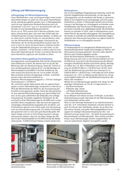 Beispiele für typische konstruktive Wärmebrücken sind: Folgen eines nicht luftdichten Gebäudes können sein: – Fensterbank und -sturz – unbehagliche Zugluft (an windreichen Tagen wurde in Dach- – Auskragendes Vordach geschossen ein Luftwechsel gemessen, der mehr als dem – Balkon als auskragende Betonplatte dreißigfachen des hygienisch notwendigen Luftwechsels ent- – Betonstütze oder Ringanker in der Außenwand sprach) – Betondeckenauflager – große Lüftungswärmeverluste (Energieverbrauch) durch aus- strömende warme Raumluft Wärmebrücken durch unsachgemäße Ausführung können – Bauschäden durch Ausfall von Tauwasser (Konsequenzen: entstehen, wenn z. B. die Dachdämmung nicht das gesamte Holzfäule, Schädlingsbefall, Schimmelbildung). Gefach füllt, bei Lücken in der Dämmung, bei mangelhaft – So kann im Vergleich zur Wasserdampfdiffusion z. B. über ausgeführten Luftdichtungen oder bei Bauteilübergängen. 1 m² Dachfläche durch eine 1 m lange und nur 1 mm breite Fuge die 1.000 bis 2.700-fache Wasserdampfmenge in Vermeidung/Reduzierung von Wärmebrücken kürzester Zeit in den Dachaufbau einströmen und dort Feuch- Durch gute Planung und Bauausführung können aber Wärme- teschäden verursachen. brücken vermieden oder stark reduziert werden. Dabei sind folgende Punkte zu beachten: Luftdichte Ausführung – Falls an Bauteilanschlüssen unterschiedlich starke Däm- Luftdicht wird ein Gebäude dann, wenn die Dichtung als nicht mungen aneinander grenzen, sollten die Mittellinien der unterbrochene Ebene das Gebäude innen vollständig um- Dämmlagen ineinander übergehen. So wird z. B. das Fens- schließt, um Luftströmungen von innen nach außen zu verhin- ter optimal im Zentrum der Außenwanddämmung einge- dern. Dazu wird eine Luftdichtung stets auf der warmen Seite baut. eines Bauteils (innen) montiert und übernimmt beim Dach oft – Die Dämmstofflagen verschiedener Bauteile sollten an den auch die Funktion einer Dampfbremse. Bei einer Außenwand Stoßstellen lückenlos ineinander übergehen, so z. B. die bildet der Innenputz bereits eine gute Luftdichtung. Dämmung der Dachschräge in die Dämmung der Außen- Schwachpunkte sind wie bei den Wärmebrücken alle Übergän- wand. ge von einem auf ein anderes Bauteil (z. B. Fenster an Wand – Ist die Wärmebrücke vielleicht auch vollständig zu vermei- oder Dach an Außenwand), mangelnde Verklebungen von Luft- den? Viele Balkone werden tatsächlich gar nicht mehr be- dichtungen (z. B. Folien, Baupapier oder Holzwerkstoffplatten) nötigt und können abgebrochen werden. Oder es wird ein untereinander sowie alle Durchdringungen von innen nach au- neuer, von der Außenwand thermisch getrennter Balkon ßen (u. a. Steckdosen, Kamin, Antennenmast, Heizungs-, Wasser- errichtet. und Abwasserrohre, Installationsschächte oder Türen). Bei der Planung und unbedingt bei der Ausführung durch die Luftdichtheit des Gebäudes Handwerker ist deshalb auf eine luftdichte Gebäudehülle größ- Jedes Gebäude – erst recht ein sehr gut gedämmtes – setzt ten Wert zu legen. Entsprechende Materialien und Ausfüh- auch eine hohe Luftdichtheit der Gebäudehülle zum Schutz rungshinweise sind zahlreich und bewähren sich seit langem. der Bausubstanz, zur Erzielung der Behaglichkeit, zur Siche- Die Überprüfung der Luftdichtheit ist vergleichsweise einfach. rung der geplanten Energieeinsparung und zum Schutz der Es wird eine Blower-Door-Messung durchgeführt, die mögli- Bausubstanz voraus. che Lecks aufspürt. Die Messung und die einzuhaltenden Ist ein Gebäude nicht luftdicht, kann je nach Luftdruckunterschied Werte für die Luftdichtheit des Gebäudes werden auf Seite 14 zwischen innen und außen 2 – 30 mal mehr Wärme verloren beschrieben. gehen als durch die gesamte gedämmte Fläche entweicht. Dies Schließlich ist eine gute Luftdichtheit auch eine wichtige Vor- ist häufig ein schleichender Vorgang, der frühestens dann von aussetzung für die Funktion der stets notwendigen Lüftungs- Bauherren und Architekten bemerkt wird, wenn trotz bester anlage mit Wärmerückgewinnung. Unkontrollierte Luftströme Wärmedämmung die erhofften Energieeinsparungen nicht in sind nicht erwünscht, da sie die Leistungsfähigkeit der Anlage vollem Umfang realisiert werden. spürbar verringern. Vorher: auskragendes Vordach Nachher: Vermeidung der Wärmebrücke Luftdichte Durchführung von Elektrokabeln 13