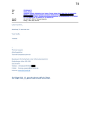 74 Von: GP Abteilung TK An: Welsch, Günther Cc: Schabhüser, Gerhard; Schönbohm, Arne; Caspers, Thomas; Samsel, Horst; Häger, Dirk; GP Leitungsstab; GP Stab 1 - Strategische Kommunikation und Presse; GP Referat KM 14; GP Stab 3 - Strategie und Leitungsunterstuetzung; GP Geschaeftszimmer_TK; GP Referat BL 23; GP Abteilung BL; GP Abteilung OC; GP Abteilung KM Betreff: AW: AW: EILT!: BSIG § 7 Warnung Kaspersky Datum: Freitag, 4. März 2022 19:30:41 Lieber Günther, Abteilung TK zeichnet mit. Viele Grüße Thomas -- Thomas Caspers Abteilungsleiter Technik-Kompetenzzentren Bundesamt für Sicherheit in der Informationstechnik Godesberger Allee 185-189 53175 Bonn Telefon: +49 (0)228 99 9582 E-Mail: thomas.caspers@bsi.bund.de Internet: www.bsi.bund.de Es folgt 011_0_geschwärzt.pdf als Zitat.