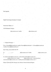 Kind regards, Digital Technology Developer Sr Analyst Hauszmann Alajos u. 2 1116 Budapest, Hungary @accenture.com <mailto: " )(S)accenture.com> ...... Original Message...... From: J.Freund@labo.berlin.de <mailto:J.Freund@labo.berlin.de> <J.Freund@labo.berlin.de <mailto:J.Freund@labo.berlin.de> > Sent: Friday, July 8, 2022 3:07 PM . To; ' , ....... < s@accenture.com <mailto 2s@accenture.cpm> > • ' , • . ' Cc: Autista-Admin@labo.berlin.de <mailto:Autista-Admin@labo.berlin.de>; : , jer@accenture.com <mailto 5r@accenture.com> >; Personenstand <personenstand@accenture.com <mäilto;personenstand@accenture.com> > ■ ' Subject: [External] AW: Anfragen des örtlichen Datenschutzbeauftragten ' io