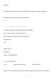 Hallo Frau ' ‘ können Sie eine Zeitschiene nennen ? Wir benötigen die Auswertung so schnell wie möglich. Viele Grüße aus Berlin und ein schönes WochenendeZ 1,". — - r- , Landesamt für Bürger- und Ordnungsangelegenheiten (LABO) Abt. II - Personenstands- und Einwohnerwesen . Fachverfahren Ordnungsämter, Personenstandswesen Gruppenleitung II Bl . Klosterstrasse 71 10179 Berlin . Telefon; +49 30 90269 2201 Fax: + 49 30 9028 3448 E-Mail ' ' J(a)labo.berlin.de <mailtc _ '(cDlabo.berlin.de> Hinweis: Die E-Mail-Adresse ist nicht für den Empfang elektronisch signierter Dokumente geeignet. ii