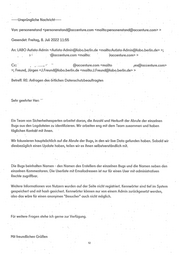 Subject: [Exfernal] Anfragen des örtlichen Patenschutzbeauftragten This messaae is from an EXTERNAL SENDER - be CAUTIÖUS. aarticularlv with links and attachments. •w> / I. / Sehr geehrter Herr Langer, können Sie die Anzahl der Abrufe der Tickets aus dem neuen Bugzilla benennen? Also wie oft wurde auf welches Ticket zugegritfen? . Sind auch Daten von Mitarbeitern/Nutzern des Bugzilla abgeflossen? Wenn ja, wie oft und welche Daten? . , Mit freundlichen Grüßen Landesamt für Bürger- und Ordnungsangelegenheiten (LABO) Abt. II - Personenstands- und Einwohnerwesen Fachverfahren Personenstandswesen Zentrale Verfahrensbetreuung II B 10 07 Klosterstraße 71 10179 Berlin Telefon: +49 30 90269 0 Fax: + 49 30 9028 3448 14