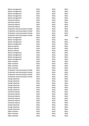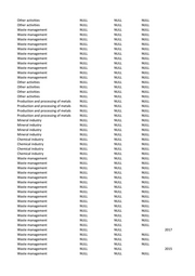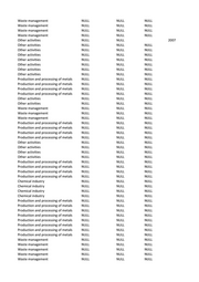 Waste management NULL NULL NULL Waste management NULL NULL NULL Waste management NULL NULL NULL Waste management NULL NULL NULL Other activities NULL NULL 2007 Other activities NULL NULL NULL Other activities NULL NULL NULL Other activities NULL NULL NULL Other activities NULL NULL NULL Other activities NULL NULL NULL Other activities NULL NULL NULL Other activities NULL NULL NULL Production and processing of metals NULL NULL NULL Production and processing of metals NULL NULL NULL Production and processing of metals NULL NULL NULL Production and processing of metals NULL NULL NULL Other activities NULL NULL NULL Other activities NULL NULL NULL Waste management NULL NULL NULL Waste management NULL NULL NULL Waste management NULL NULL NULL Production and processing of metals NULL NULL NULL Production and processing of metals NULL NULL NULL Production and processing of metals NULL NULL NULL Production and processing of metals NULL NULL NULL Other activities NULL NULL NULL Other activities NULL NULL NULL Other activities NULL NULL NULL Other activities NULL NULL NULL Production and processing of metals NULL NULL NULL Production and processing of metals NULL NULL NULL Production and processing of metals NULL NULL NULL Production and processing of metals NULL NULL NULL Chemical industry NULL NULL NULL Chemical industry NULL NULL NULL Chemical industry NULL NULL NULL Chemical industry NULL NULL NULL Production and processing of metals NULL NULL NULL Production and processing of metals NULL NULL NULL Production and processing of metals NULL NULL NULL Production and processing of metals NULL NULL NULL Production and processing of metals NULL NULL NULL Production and processing of metals NULL NULL NULL Production and processing of metals NULL NULL NULL Production and processing of metals NULL NULL NULL Waste management NULL NULL NULL Waste management NULL NULL NULL Waste management NULL NULL NULL Waste management NULL NULL NULL Waste management NULL NULL NULL
